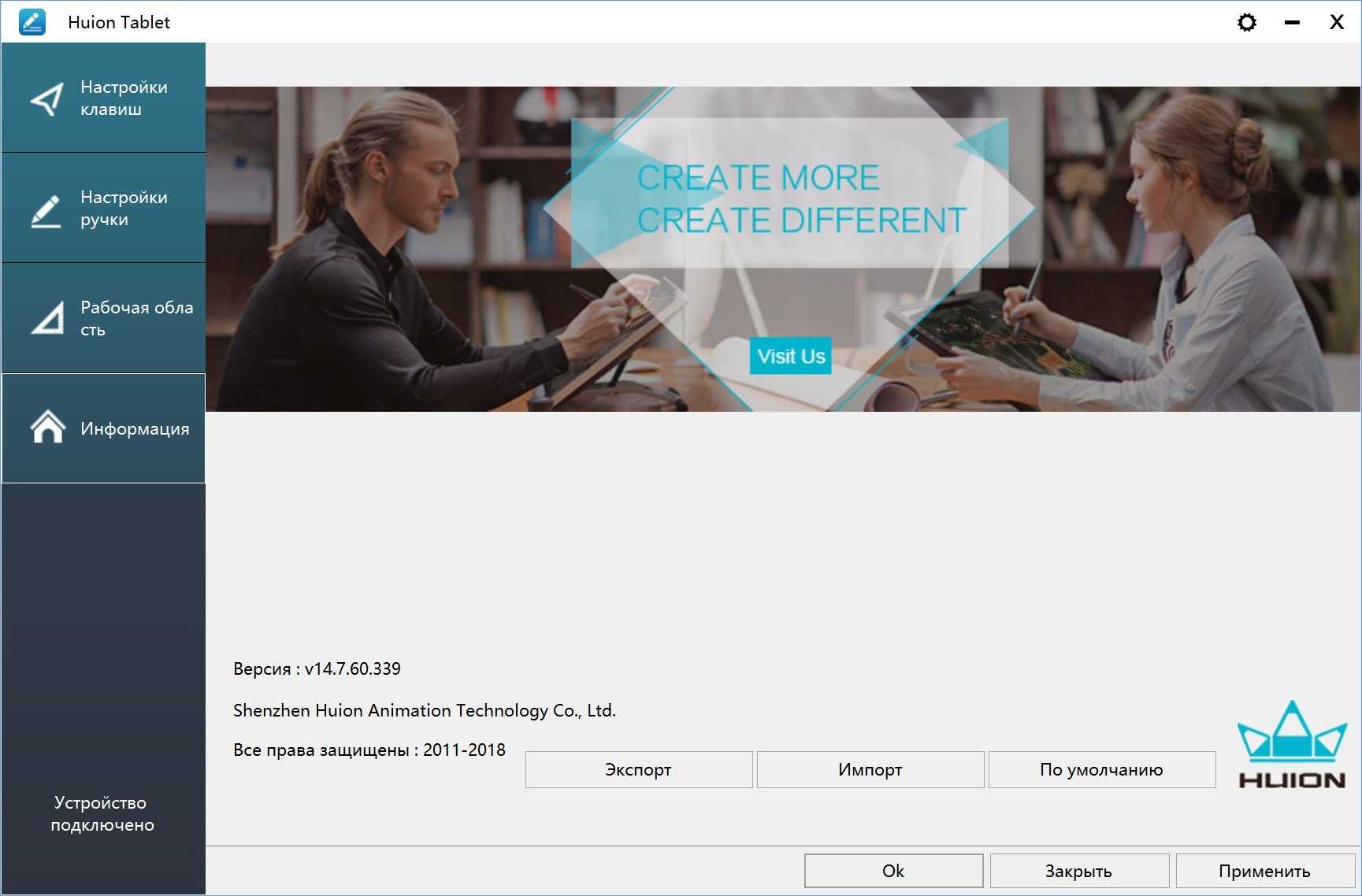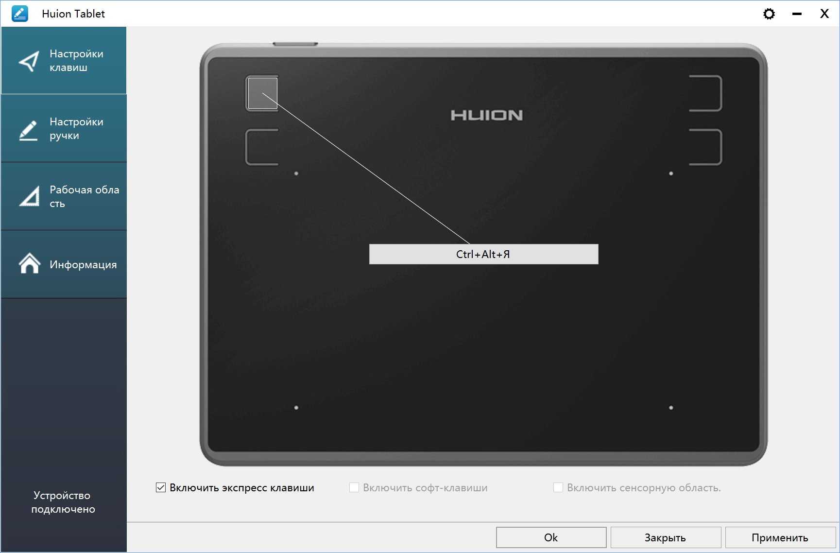 Для использования всех возможностей графического планшета Huion H430P необходимо установить утилиту Huion Tablet. Ее придется скачать с сайта производителя.