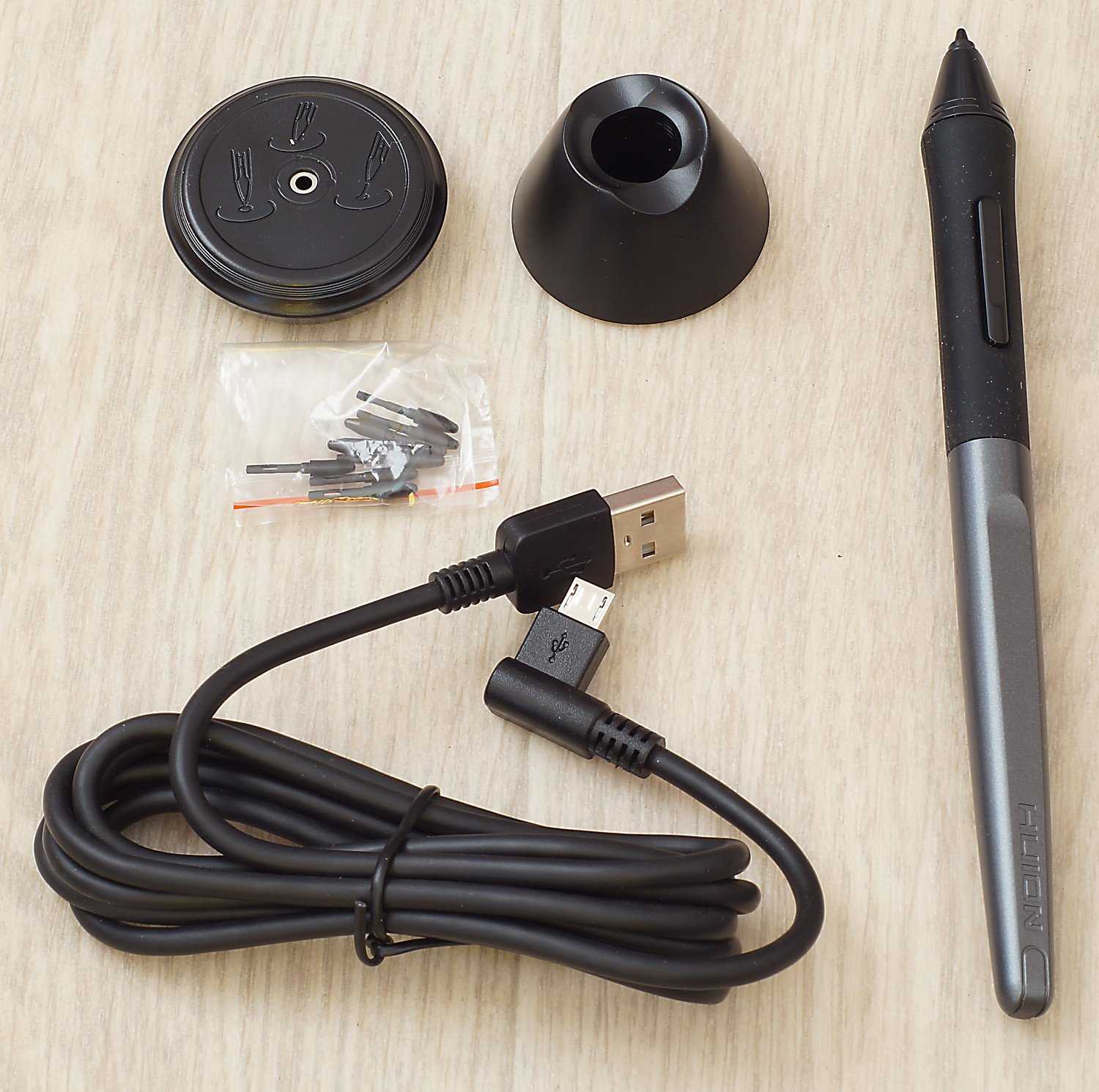 В комплект также входит: перо, подставка под перо (на дне есть изображение как правильно извлекать сменные перья), 8 перьев и micro USB кабель. Не хватает только тряпочки для протирания рабочей поверхности.