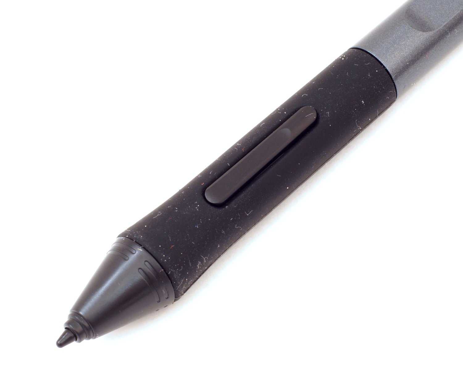 Область хвата у пера утолщена и имеет софт-тач покрытие, которое будет легко собирать частички пыли. Причем в этой же области размещены две кнопки, которые тактильно отличаются друг от друга (одна выше, другая ниже).