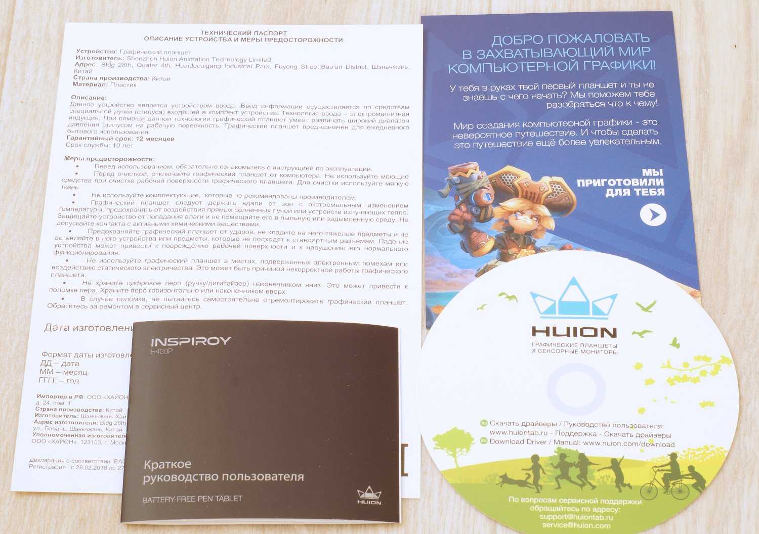 Гораздо больше информации представлено в техническом паспорте/гарантийном талоне, содержащем правила пользования. Он лежит внутри коробки вместе с кратким руководством пользователя и листочке о необходимости скачать драйвера. Также имеется отдельный листочек со ссылкой на урок о компьютерной графике и о том, как работать с планшетом (его возможностях).