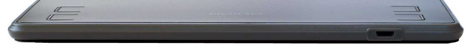 Толщина планшета сравнительно небольшая (~7 мм). Девайс подключаетсяк компьютеручерез порт micro USB, размещенный в широком торце вверху.