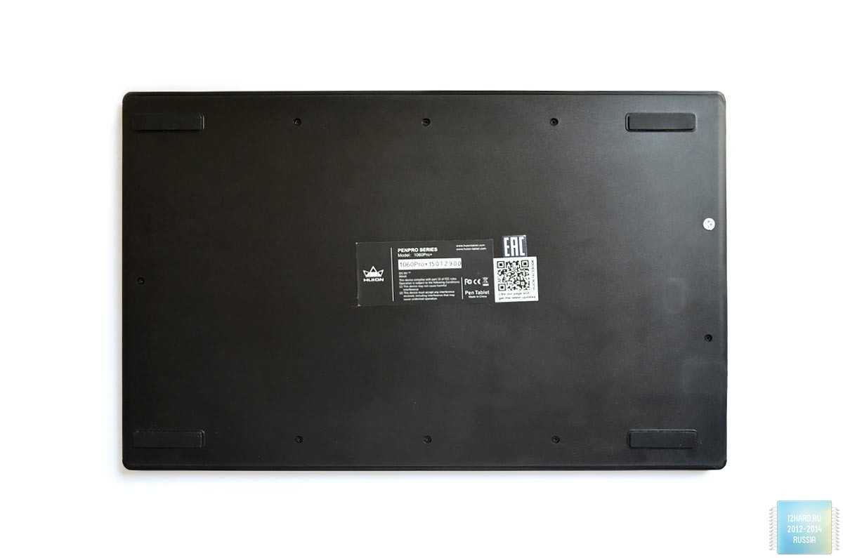 Снизу находятся 4 резиновых ножки, которые прочно удерживают планшет на столе: он совершенно не скользит. Также снизу можно заметить отверстия для 9 винтов, с помощью которых собран плашнет, и наклейку с названием модели и датой производства.