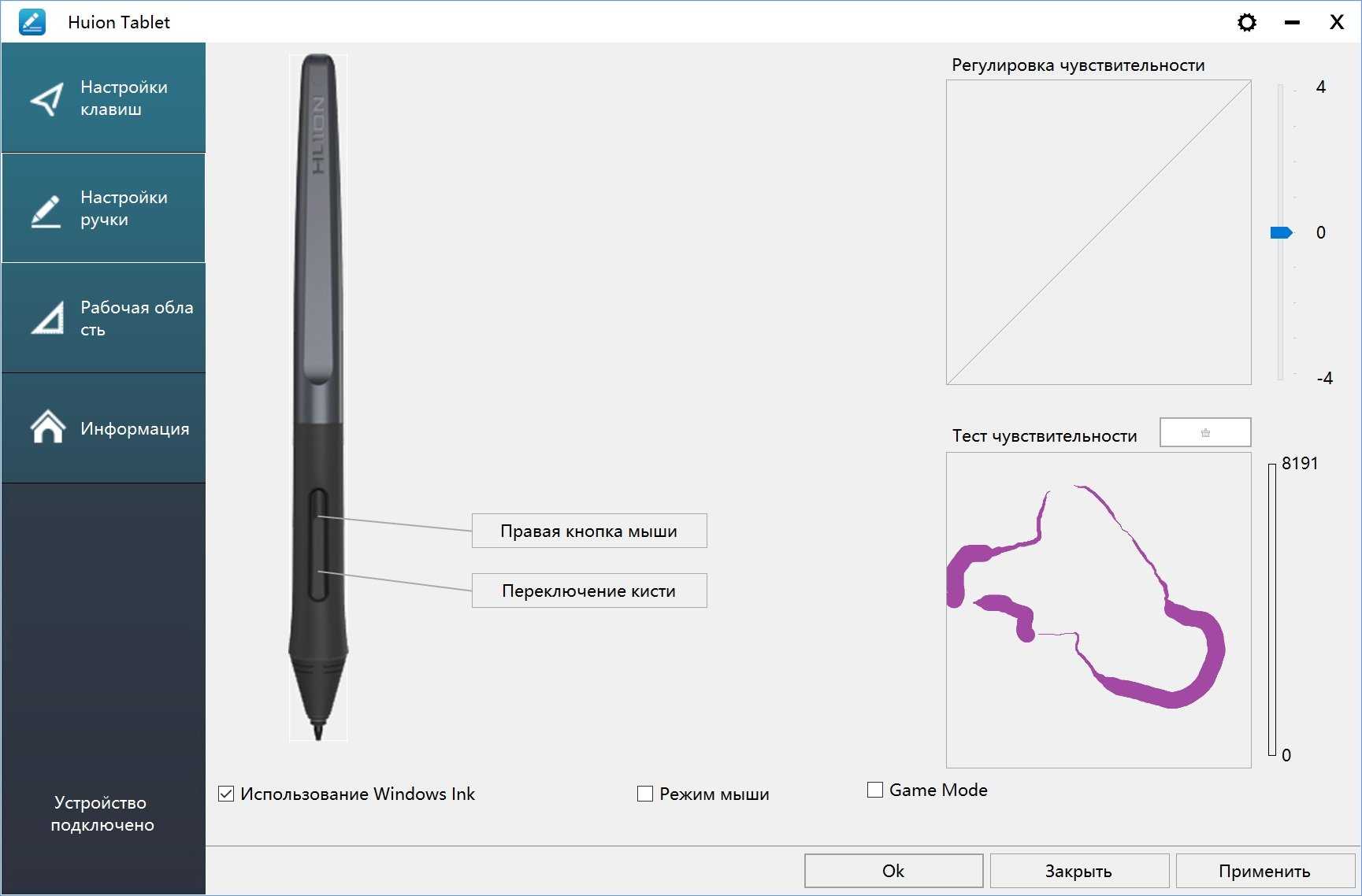 2. Также возможно «запрограммировать» действия на две кнопки пера. Это делается через раздел «Настройки ручки». Здесь же настраивается чувствительность и можно провести тест.