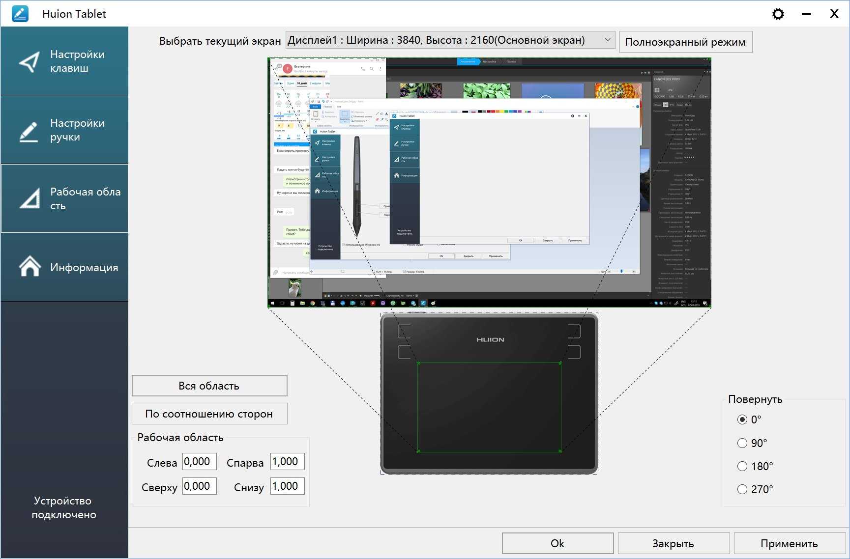 3. В разделе «Рабочая область» привязываем работу планшета к определенному монитору, задаем область и, если необходимо, поворачиваем ее на угол, кратный 90 градусам.