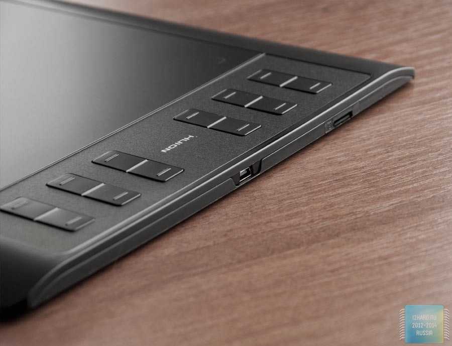 Сбоку находятся целых 12 программируемых кнопок. Драйвера надо качать с сайта российского представительства Huion, иначе будут работать лишь 8 кнопок. Еще у планшета на рабочую поверхность нанесены пиктограммы для 16 софт-клавиш, на которые можно повесить дополнительно 16 функций, которые будут срабатывать при касании пером.