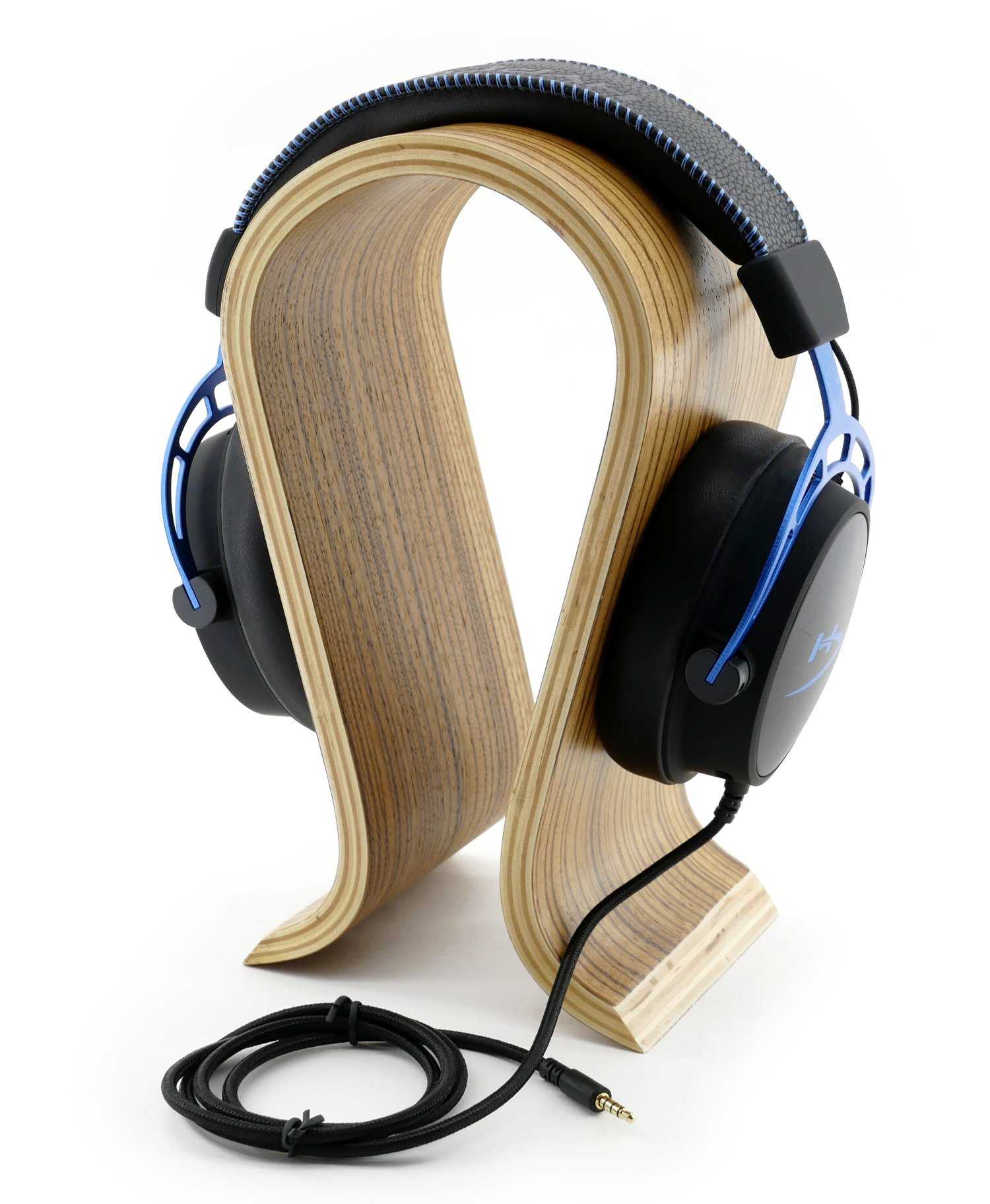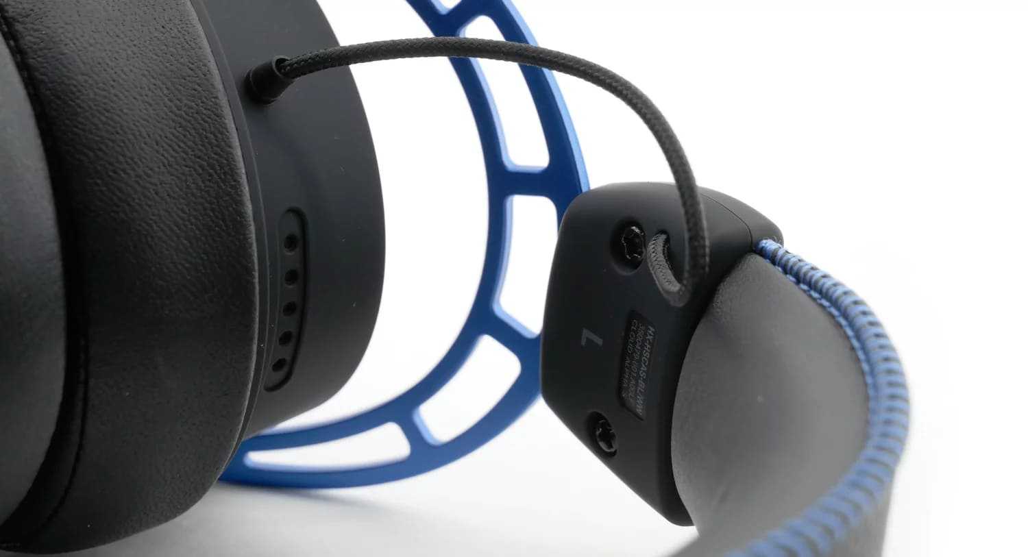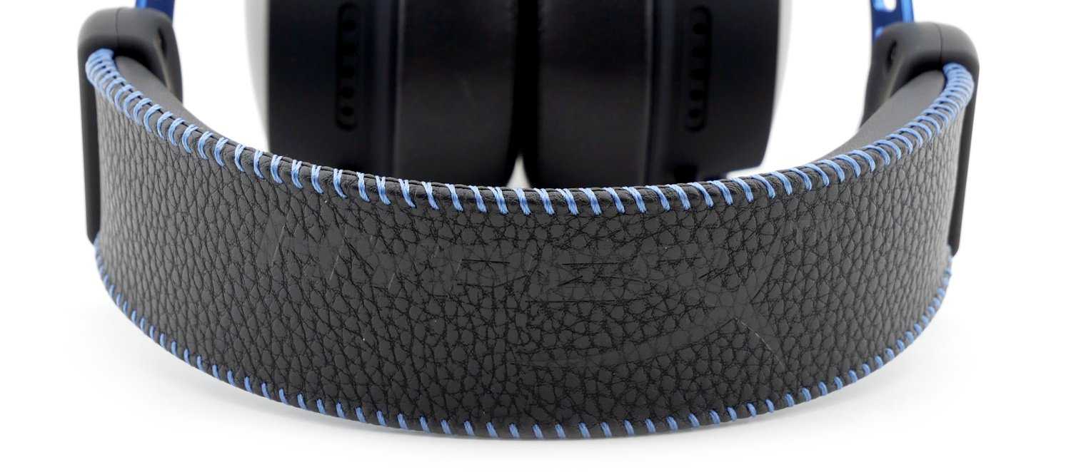 С внешней стороны оно приукрашено кожаной вставкой с характерными швами из синих ниток и логотипом HyperX, подчеркивающим визуальный стиль наушников.