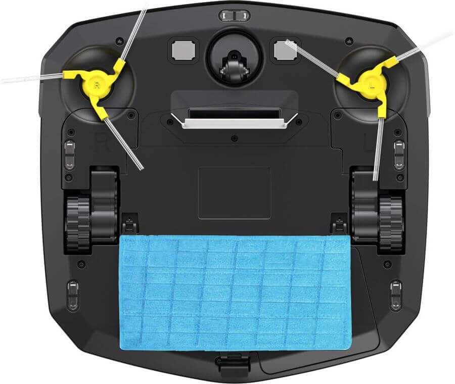 Перевернув робот, мы видим два боковых колеса, передний ролик для разворотов, пару боковых щёток, всасывающий модуль ближе к центру, отсек аккумулятора, датчики против падения и переворотов. Здесь же имеется область для закрепления специальной насадки с тряпочкой для влажной протирки гладких напольных покрытий.