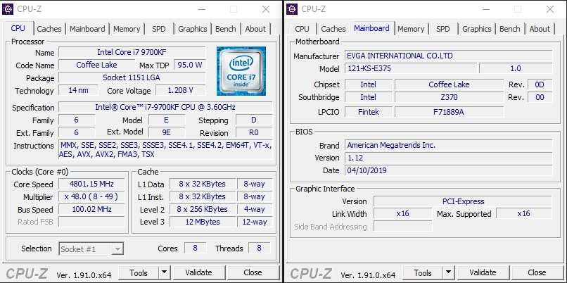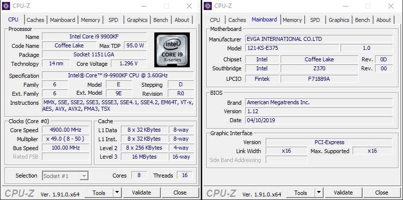 Информация в программе CPU-Z указывает на то, что нам на тестирование достался Core i9-9900KF со степпингом R0. В операционной системе Windows 10 при нагрузке на 1-2 ядра процессор исправно повышает тактовую частоту до 4900-5000 МГц.