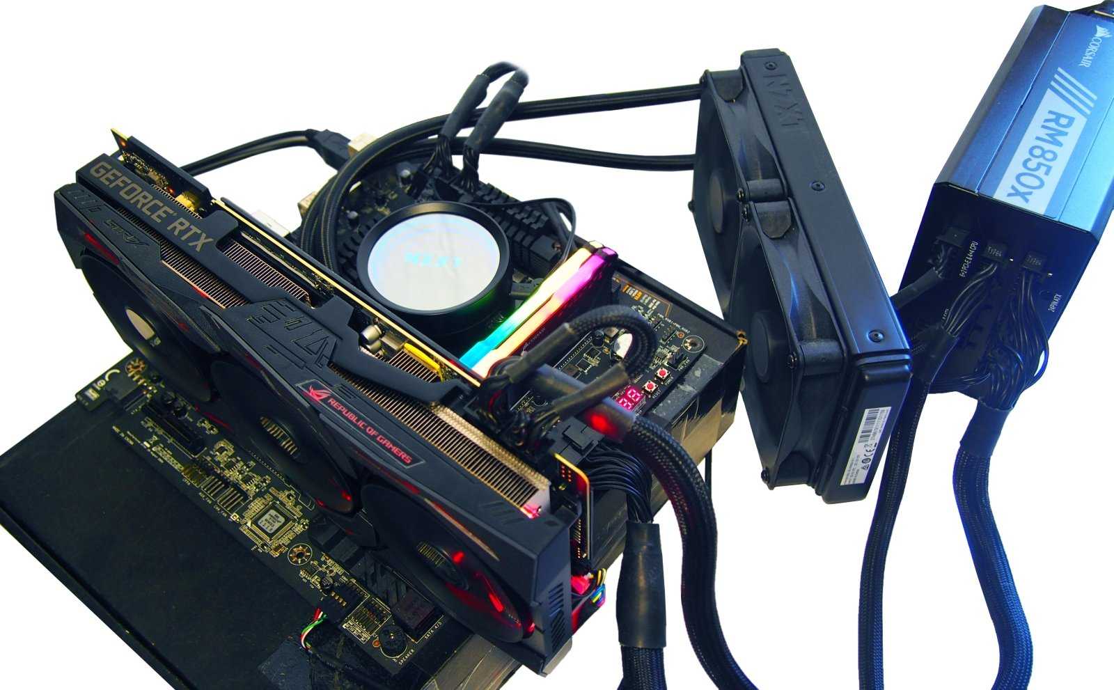 Для лучшего температурного комфорта тестирование проводилось на открытом стенде. За охлаждение процессора Core i9-9900KF отвечала система жидкостного охлаждения AIO типа NZXT Kraken X53. Раскрывать игровой потенциал тестируемого CPU в играх вызвалась роскошная видеокарта ASUS Strix RTX 2080 Ti.