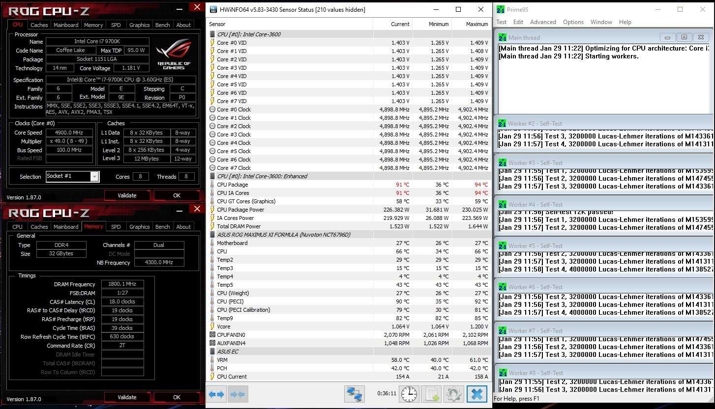 - Core i9-9900KF в разгоне до 5.0 ГГц при дельте AVX -1 с памятью DDR4-3600 с таймингами 18-19-19-39;