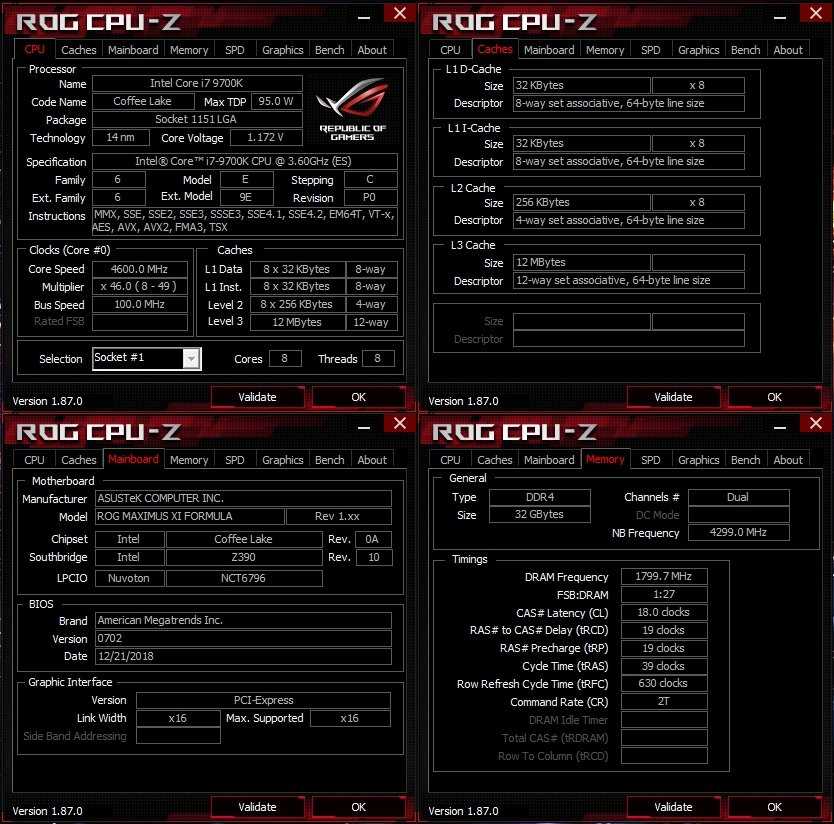 - Core i7-9700KF на штатной частоте с памятью DDR4-2133 с таймингами 15-15-15-36;