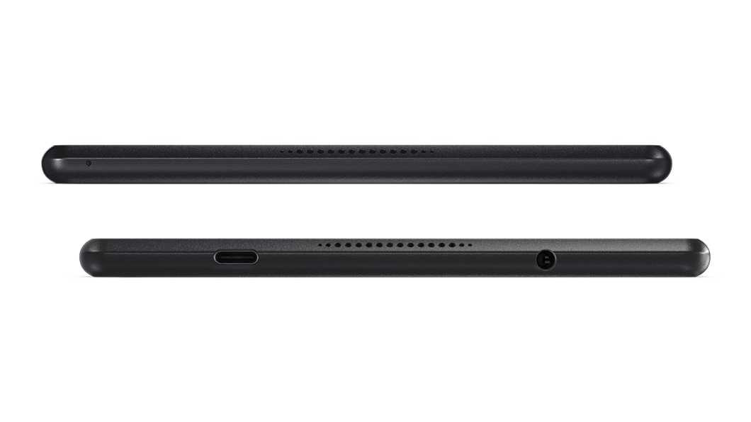 Кнопки питания, повышения и понижения громкости расположены на правой грани планшета, а небольшая вставка с логотипом Lenovo и слотом для карт памяти MicroSD — на левой. Фронтальные динамики разместились на верхней и нижней частях гаджета, а зарядный порт и 3,5-мм аудиоразъём для наушников — на верхней грани.