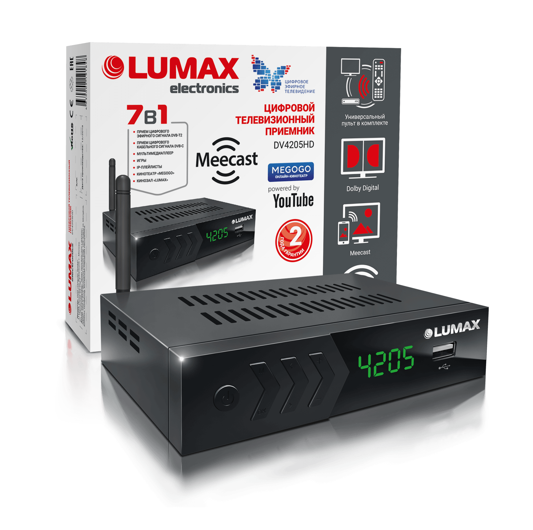 | Описание | Цифровой телевизионный приемник DVB-T2/DVB-C с расширенным функционалом. Устройство 7-в-1 имеет возможность выхода в интернет через WiFi-адаптер из комплекта поставки для просмотра IP-плейлистов и фильмов из онлайн-кинотеатров. При подключении к интернет, доступны сервисы YouTube, Погода, Google карты, Кинозал Lumax, онлайн-кинотеатр Megogo. Также есть игры и все атрибуты медиаплеера. Для записи эфирного телевидения можно использовать приобретаемые отдельно внешние USB-накопители для хранения данных. Пульт ДУ в комплекте, мощный процессор и меню на русском языке. |
