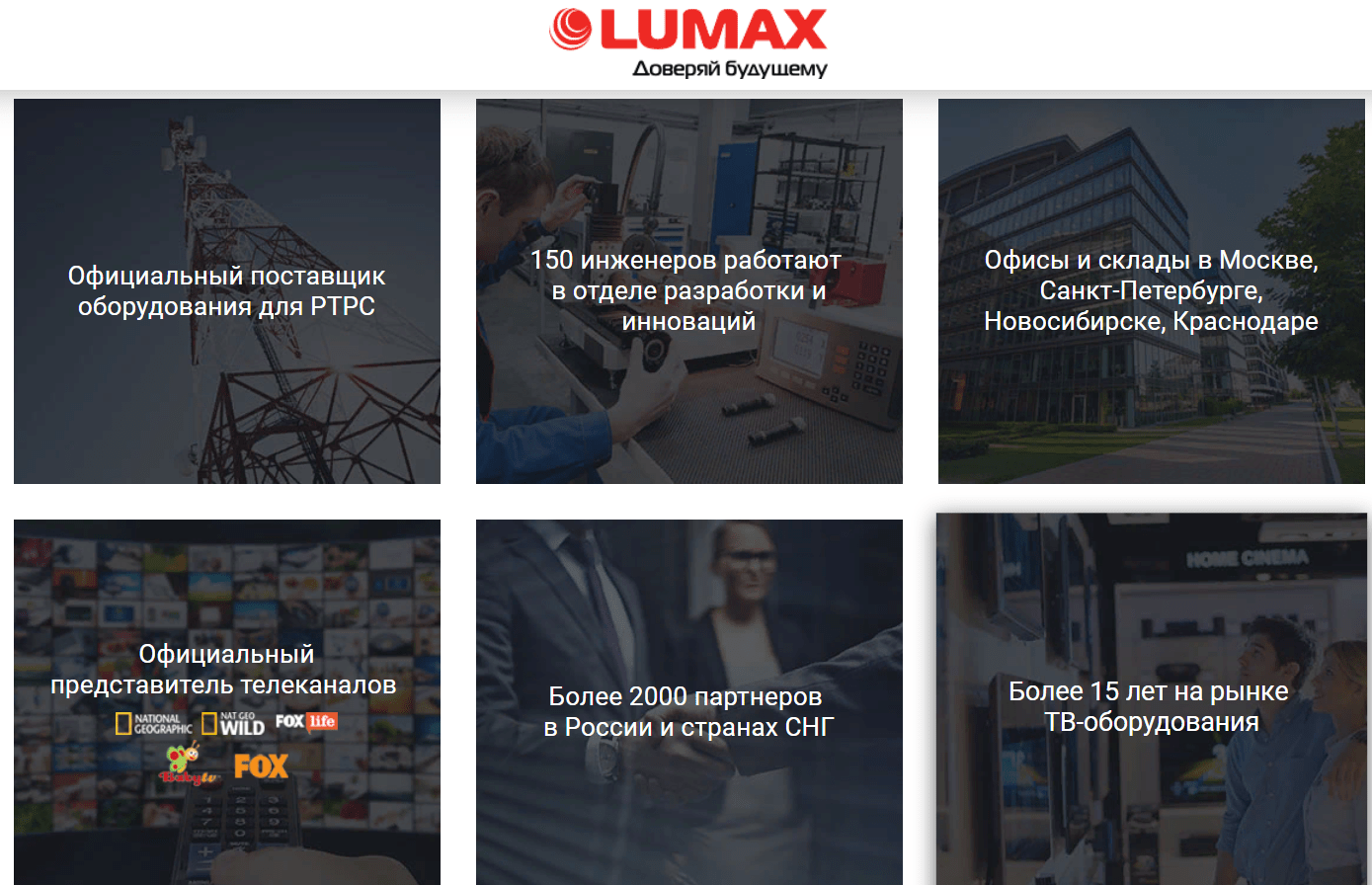 По современным меркам компания Lumax – это молодой игрок на рынке. Фирма появилась в 2001 году, но успела пройти большой путь. Сегодня она главный поставщик оборудования для РТРС и имеет их сертификацию. Это говорит о том, что цифровые приставки Lumax и прочее оборудование компании соответствует высокому стандарту качества. РТРС – это не единственный партнер бренда. Сегодня компания Lumax обеспечивает оборудованием большую часть российских операторов — МТС, Мегафон, Билайн, Ростелеком, НТВ Плюс, а также активно сотрудничает с иностранными компаниями – Huawei, JVC, Conax, TP-Link и другими.