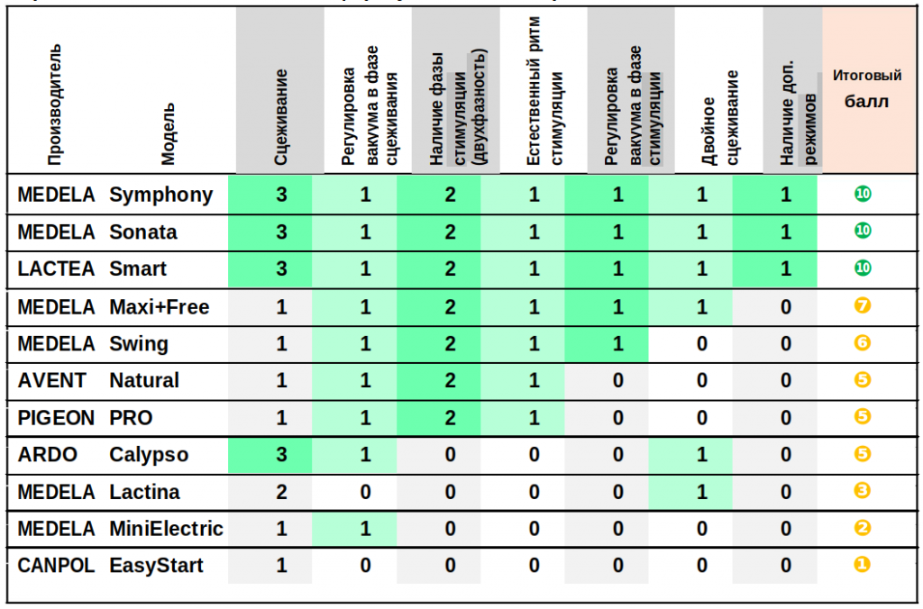 - Сцеживание: приближенность к естественному сосанию малыша: (1) — механический (пилообразный тип), (2) — боле мягкий, но не «естественный», (3) — максимально приближенный к естественному