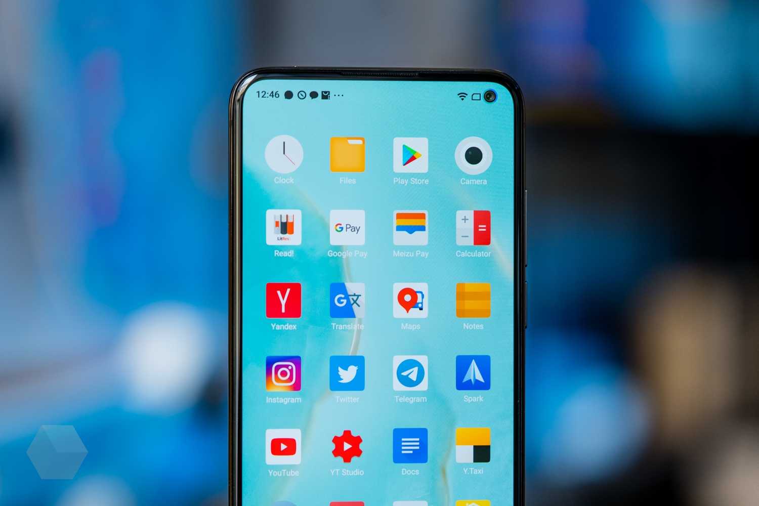 А ещё предыдущее поколение Meizu отличалось отсутствием отверстий и вырезов в экране, и этого тоже не скажешь про серию Meizu 17. Здесь есть маленький кружочек под камеру в правом верхнем углу, совсем немножко крупнее иконки в статус-баре. Казалось, фронталку хотели замаскировать – но зачем-то сделали блестящее колечко вокруг неё. Может быть, по задумке дизайнеров, оно рифмуется с кольцом вспышки на задней панели, но идея в любом случае спорная. А еще опционально в настройках можно включить отображение кольца уровня заряда вокруг фронталки – смотрится оригинально, но почему это не активно по умолчанию?