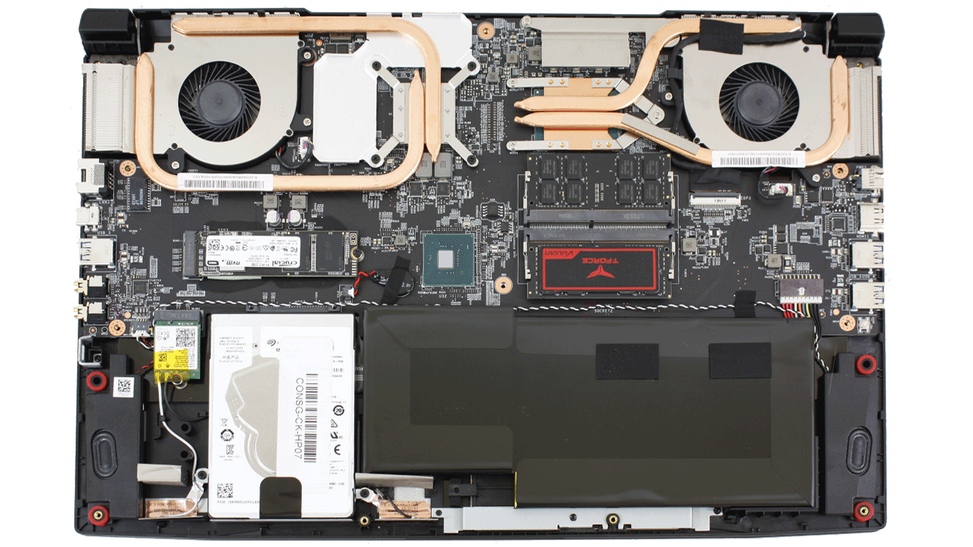 Ноутбук поддается апгрейду. Вы вольны нарастить оперативную памяти до 32 ГБ DDR4, поддерживаются планки, работающие на частоте 2666 МГц, а впоследствии можно заменить штатные накопители на более емкие. Нижняя крышка удерживается 12 обычными винтиками, но ради доступа внутрь придется повредить гарантийную пломбу. На фото внизу прошлогодняя модель MSI GF75 thin 9rcx в разобранном виде, MSI GF75 10SCXR Thin внутри выглядит также.