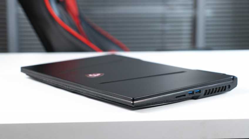 Ориентация GF75 Thin на игровой мир заметно не так уж и сильно. Красная окантовка клавиш и вентиляции, полированный металл — все говорит о том, что видим мы именно геймерскую модель. Крышка и рабочая поверхность лэптопа сделаны из алюминиевого сплава с вертикальной шлифовкой. Несмотря на геймерское позиционирование в лэптопе нет типичной агрессивности, присущей другим игровым ноутбукам, форма корпуса отличается строгостью, а дисплейные рамки – тонкостью. По сборке замечаний нет, прочность конструкции так же особых претензий не вызывает. Экранные петли в меру жесткие, но тем не менее, при больших углах открытия дисплея чувствуется небольшая слабина, при максимальном раскрытии, верхняя крышка немного поднимает базовый блок относительно поверхности, что обеспечивает лучшую вентиляцию внутренних компонентов. Все порты и разъемы легко доступны, но расположены они близко друг от друга. Справа: Слот замка Kensington, RJ-45 Ethernet, порты USB 3.1, USB 3.1 Type C Gen. 1, вход микрофона 3.5 мм, выход 3.5 мм (с SPDIF), а слева — гнездо зарядки, еще два USB 3.2и HDMI 1.4. Задняя и фронтальная панели оставлены свободными.