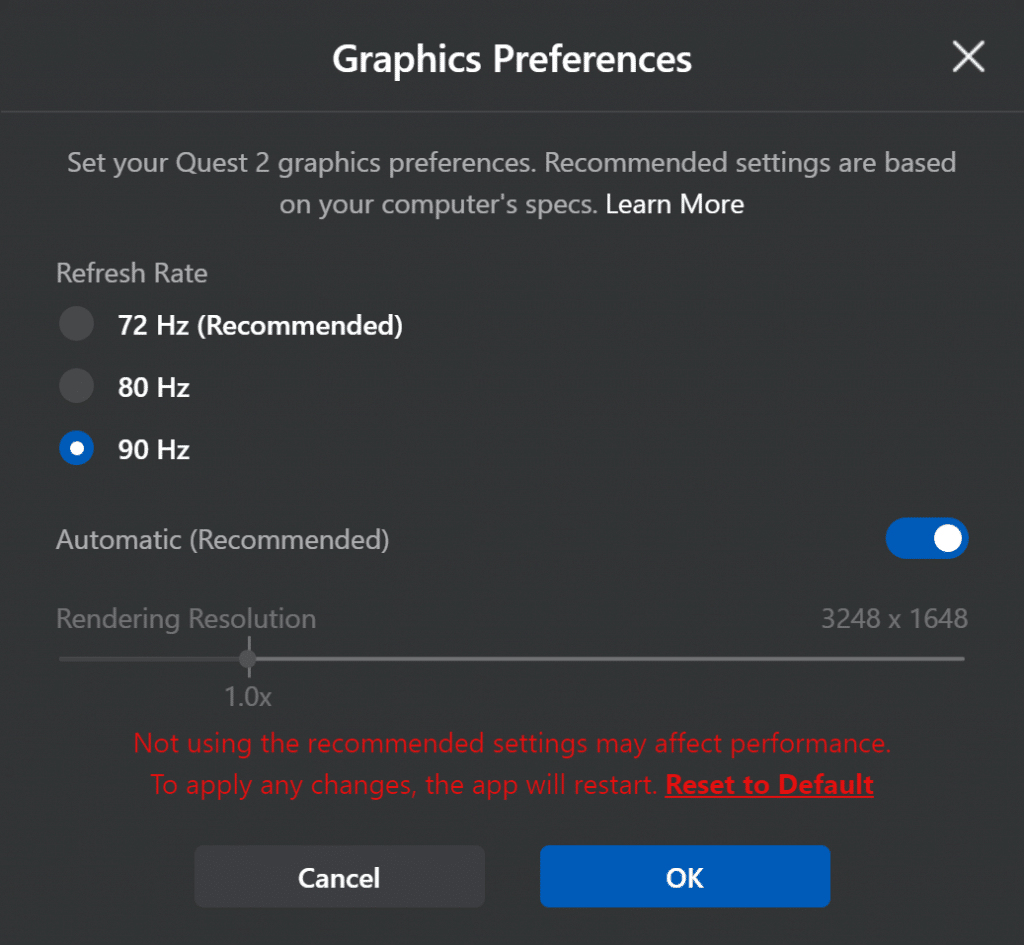 Вы можете установить его на той же панели, что и частоту обновления в приложении Oculus PC — нажмите Quest 2 и посмотрите на вкладке Устройства, чтобы найти его. Facebook рекомендует оставить его на автоматическом режиме.