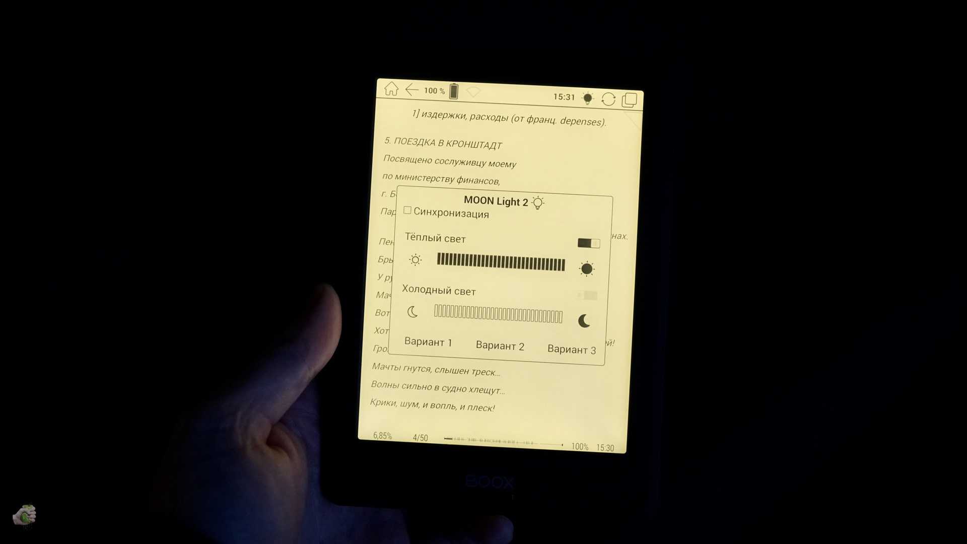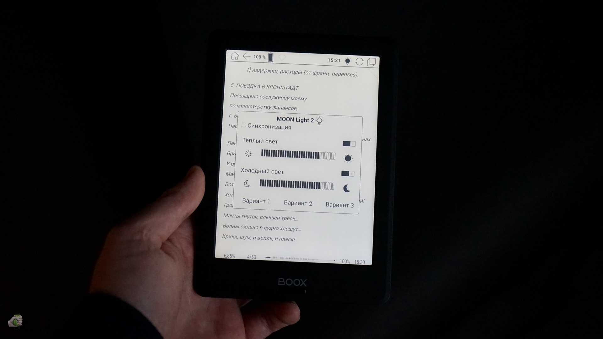 Что же касается цветовой температуры подвсветки, то на сегодня это уже визитная карточка букридеров Onyx Boox: вы можете варьировать интенсивность оранжевой и белой подсветок, чтобы подобрать температуру под себя.