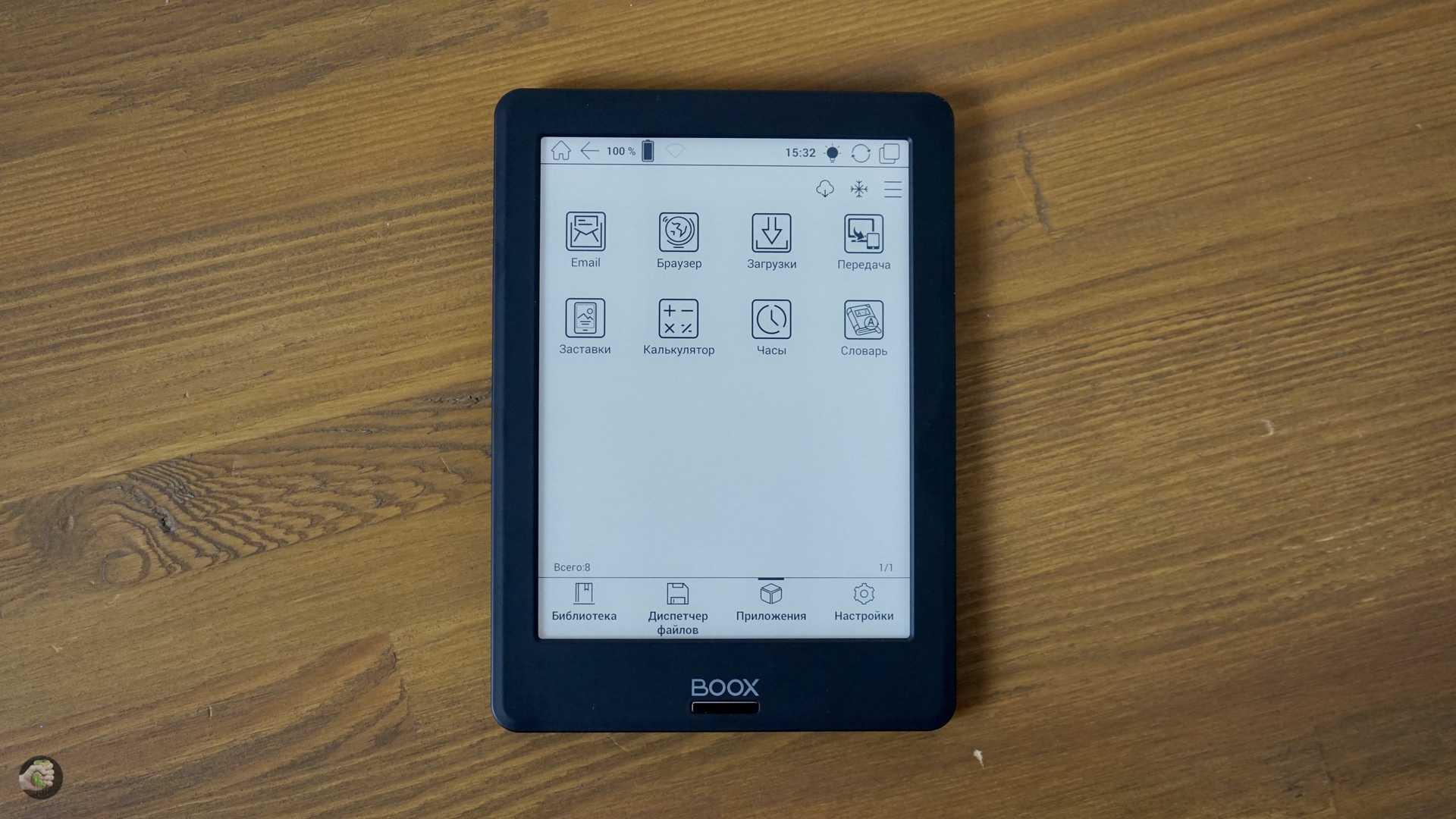 Из предустановленных приложений есть почта, браузер, калькулятор, словарь, часы. Не думаю, что вы будете пользоваться этими замечательными сервисами просто в силу специфики устройства: читать здесь очень круто, делать всё остальное не очень. Например, можно включить Wi-Fi и пойти сёрфить интернеты, но никакого смысла в этом нет, обновление экрана для браузинга явно ни о чём. Мучение.