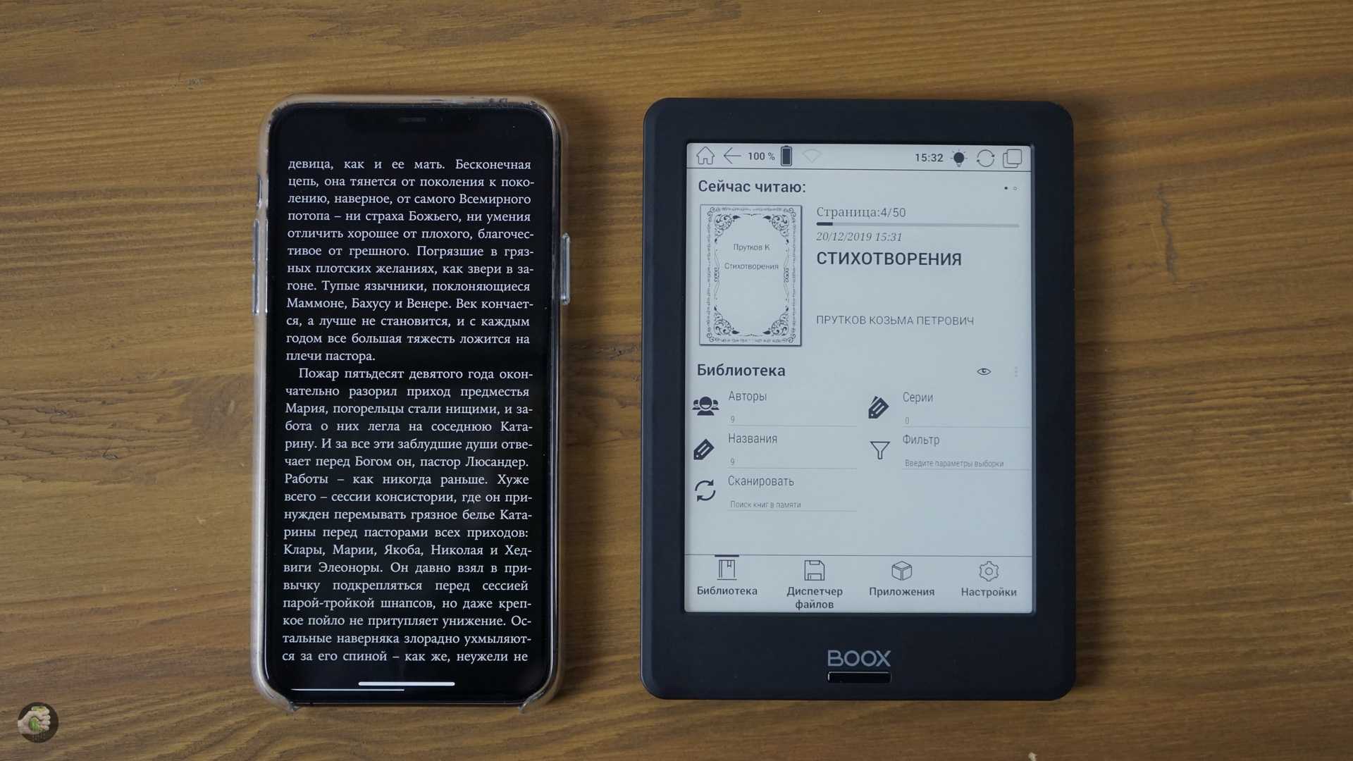 Диагональ дисплея составляет шесть дюймов, тип бумаги — E-Ink Carta Plus, всё лучшее для владельцев ONYX. Экран прекрасно реагирует на нажатия, щипком можно увеличивать и уменьшать шрифт, настроек в установленной читалке множество — любой человек сможет подогнать книгу под свои хотелки.