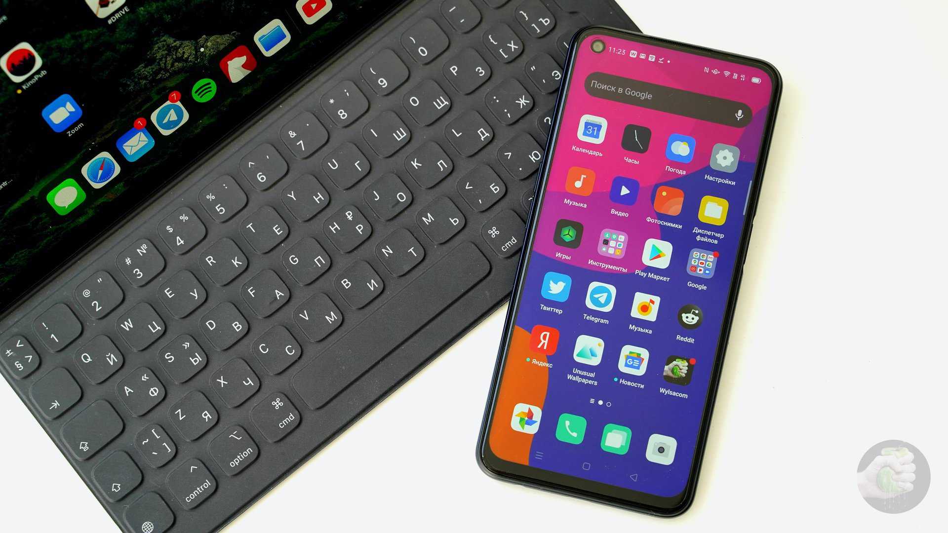 Из других приятных глазу деталей выделю фронтальную камеру, вписанную в отверстие в левом верхнем углу. Мода на отсутствие «чёлок» — тренд 2020 года. Ещё на дисплее наклеена заводская защитная плёнка, причём экран плоский, поэтому если надумаете снять её и приклеить защитное стекло, то проблем с этим не будет.