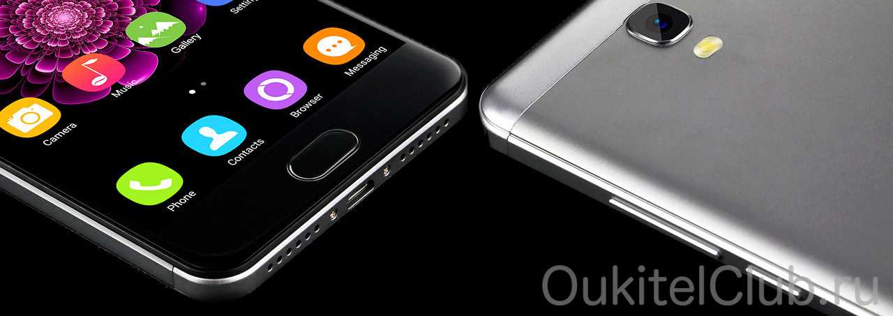 В верхней части передней панели телефона OUKITEL расположена фронтальная двойная камера, разговорный динамик, а левее — светодиодная вспышка. В нижней части, под экраном, находится механическая кнопка Home, в которую встроен сканер отпечатков пальцев, и сенсорные кнопки — назад и приложения.