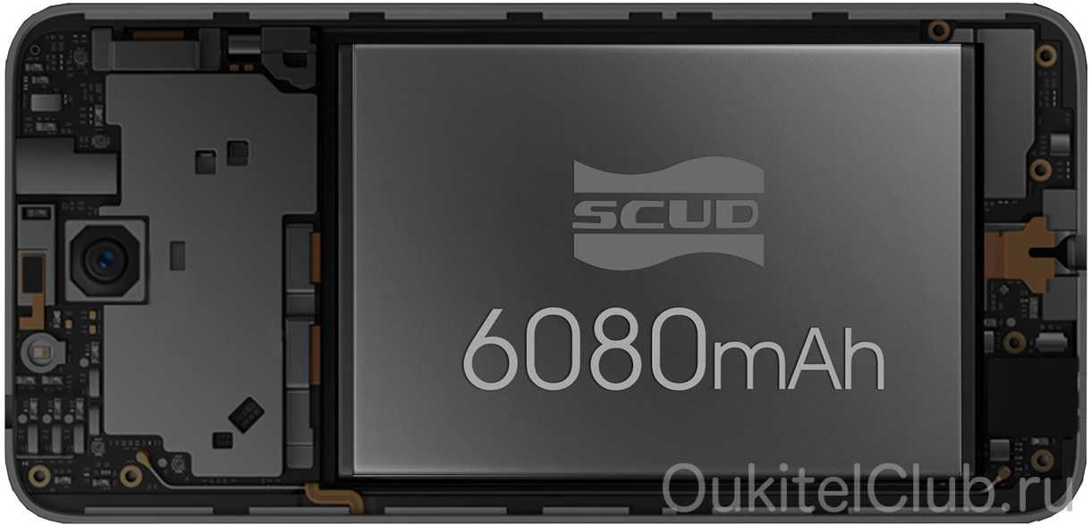 Одна из основных фишек смартфона – это аккумулятор. Oukitel не замечены в обмане с объёмом батареи, и заявленные 6080 мАч вполне реальны, что уже проверено тестами. Производитель аккумуляторной батареи – SCUD, поставщик А-брендов, уже использовался Oukitel в других топовых смартфонах. Объёма питания хватит на 10 часов активного использования (видео, игры) или более 40 часов разговора. Технология изготовления LiPol (литий-полимер).