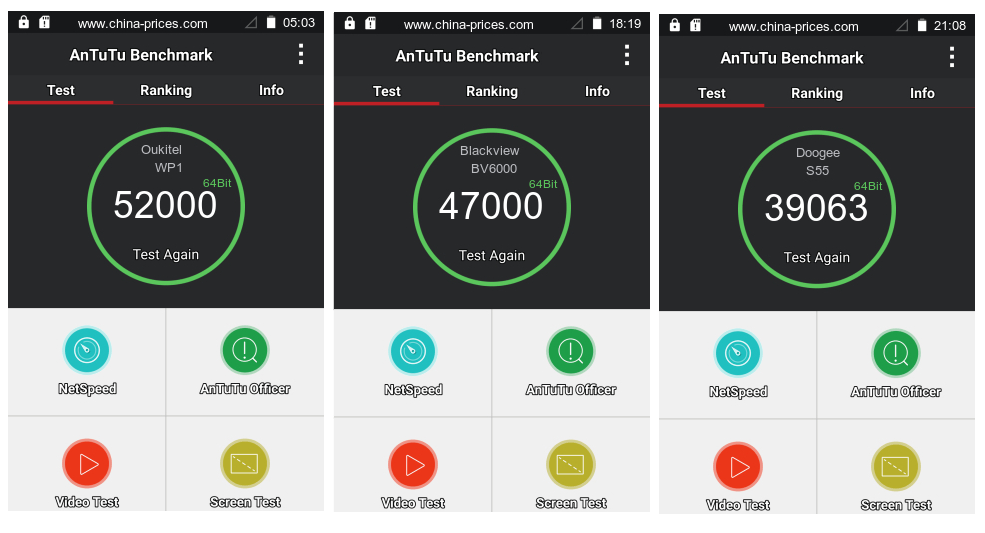 Сравнительная производительность Oukitel WP1, Doogee S55 и Blackview BV600. Источник — china-prices.com