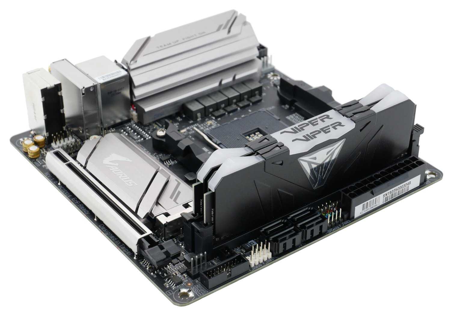 Черно-серое исполнение оперативной памяти Patriot Viper RGB 3600 МГц 2х8 Гб лучше всего вписывается к соответствующей материнской плате, в данном случае — Gigabyte B450 i Aorus Pro WiFi.