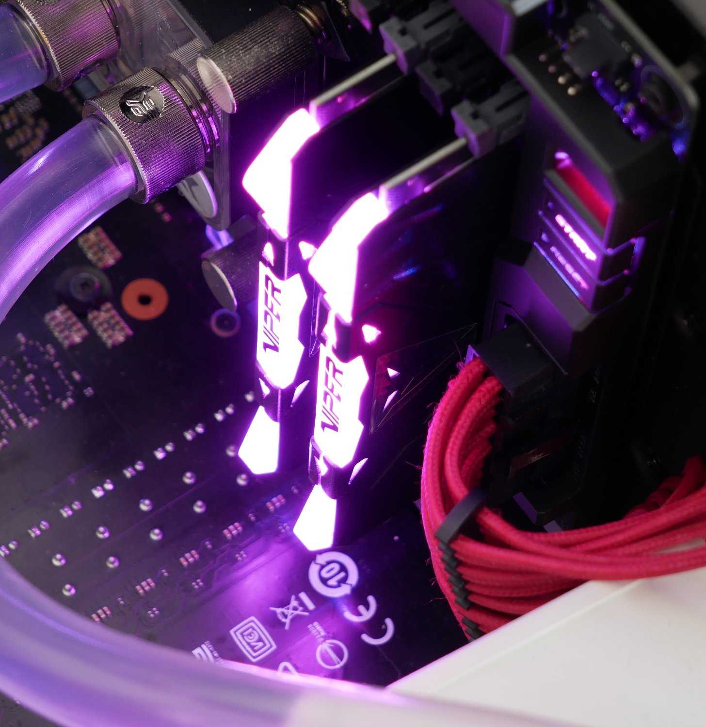 Вне зависимости от точки обзора подсветка Patriot Viper RGB 3600 МГц выглядит великолепно. На примере материнской платы ASUS Z370 ROG Maximus X Formula данный набор отлично вписывается в итоговую систему и синхронно управляется вместе с остальными компонентами.