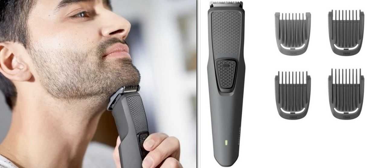 Насадка-стайлер устанавливается на место бреющего блока. Гребень стайлера устанавливает длину от 1 до 5 мм. Регулятор находится на задней части насадки.