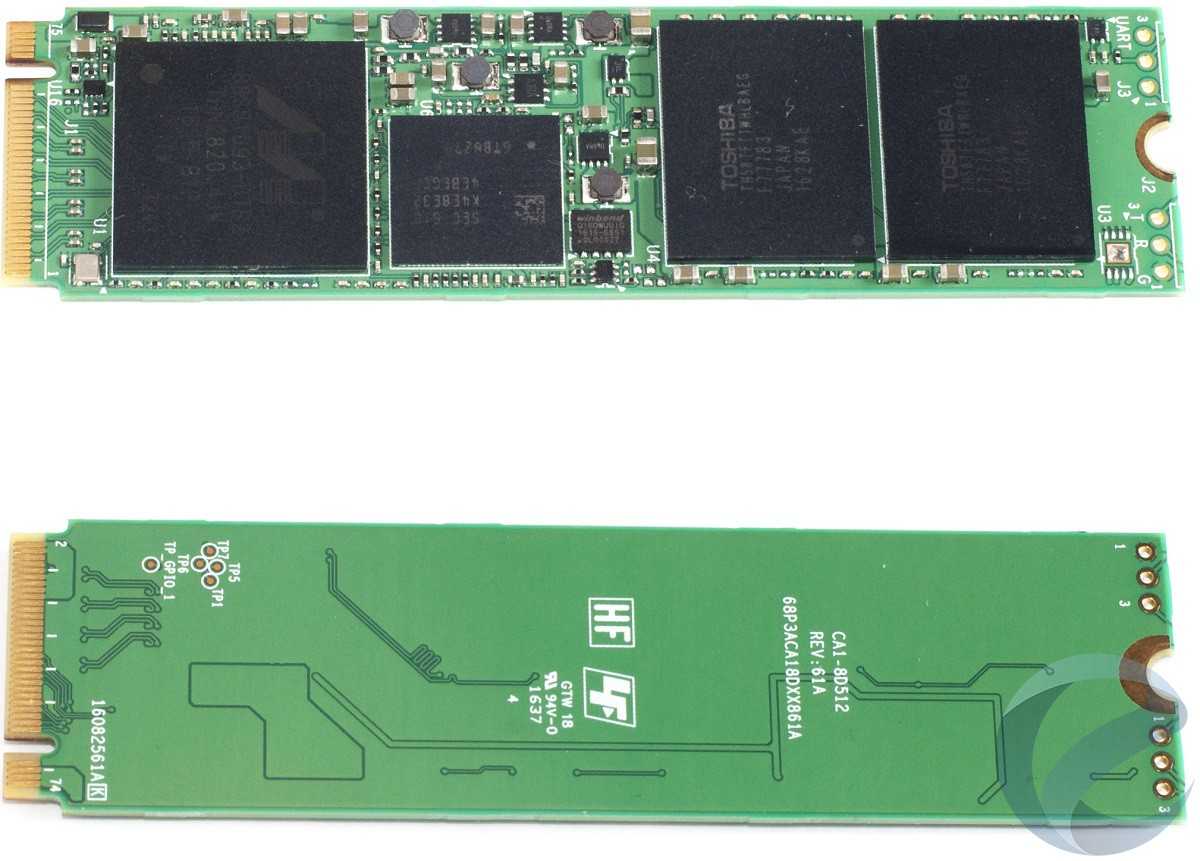 Накопитель выполнен в форматеM.2 2280 (22х80 мм) с односторонним монтажом элементов. На одной стороне располагаются четыре микросхемы:контроллерMarvell 88SS1093,DDR3L-памятьSamsung K4E8E324EB-EGCE объемом 1 Гбайт, выполняющая роль буфера, и две микросхемыToshiba TH58TFT1WHLBAEG, создающиемассив флеш-памяти.