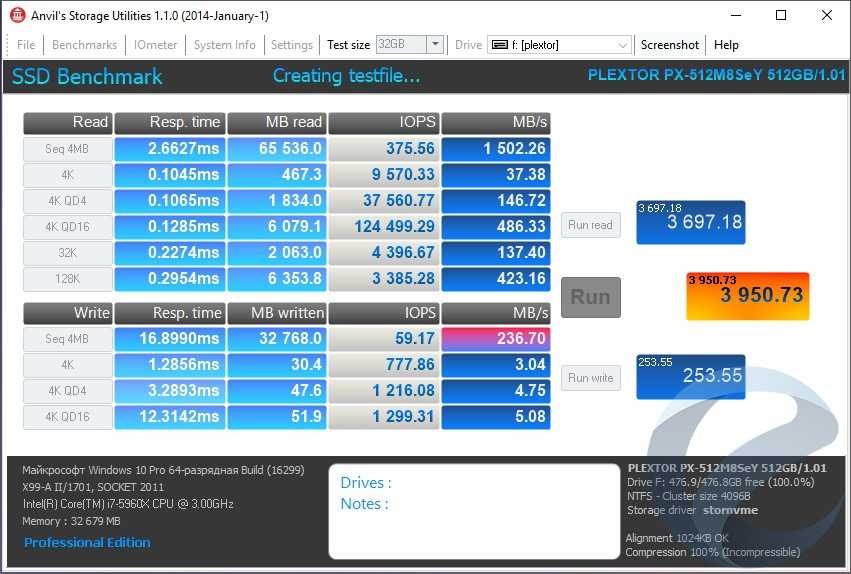 Anvil’s Storage Utilities — программа, предназначенная для комплексного тестирования и сравнения производительности разного рода накопителей информации. В данную программу входит хороший бенчмарк, проверяющий скорость чтения и записи блоками разных размеров и в несколько потоков. Результат показывается как в количестве операций, так и в Мб/с и условных баллах.
