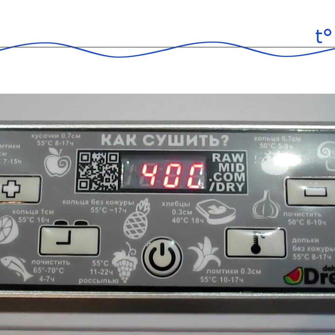 Для управления служат пять кнопок и достаточно большой дисплей. Переключением кнопок «время» и «температура» можно выставлять необходимые параметры сушки. Регулирование происходит благодаря большим кнопкам «плюс» и «минус»