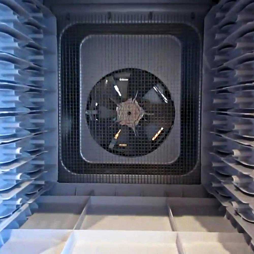 Сушка в нашем устройстве обеспечивается благодаря горизонтальному обдуву вентилятором. Последний работает с допустимыми показателями шума, поэтому не будет заглушать разговоры и мешать привычному образу жизни. Обдув происходит равномерно, чему в значительной мере содействуют сетчатые лотки.