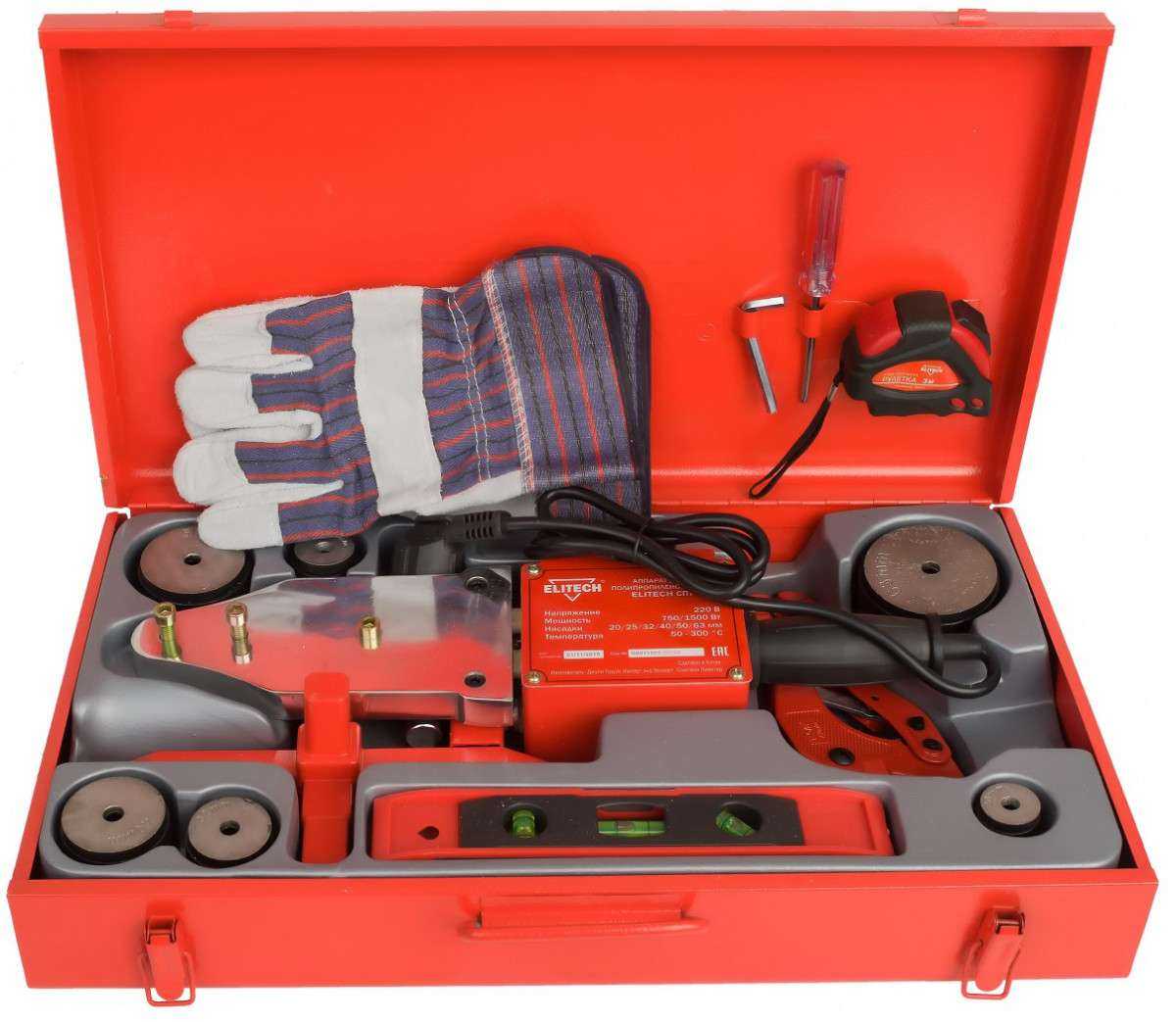 Аппарат для сварки пластиковых труб с отличной заводской комплектацией: кейс для хранения из металла, 6 сварочных насадок, защитные перчатки, рулетка, отвёртка и труборез. Имеется регулируемый термостат, помогающий контролировать рабочую температуру. Прибор предназначен для бытового использования. Мощность аппарата составляет 1500 Вт, температура – 300 °C. Входящее напряжение 220 Вт, а частота пайки 50 Гц. Тип основной насадки относится к парному типу, что обеспечивает безопасный, щадящий нагрев полипропиленовых соединений.