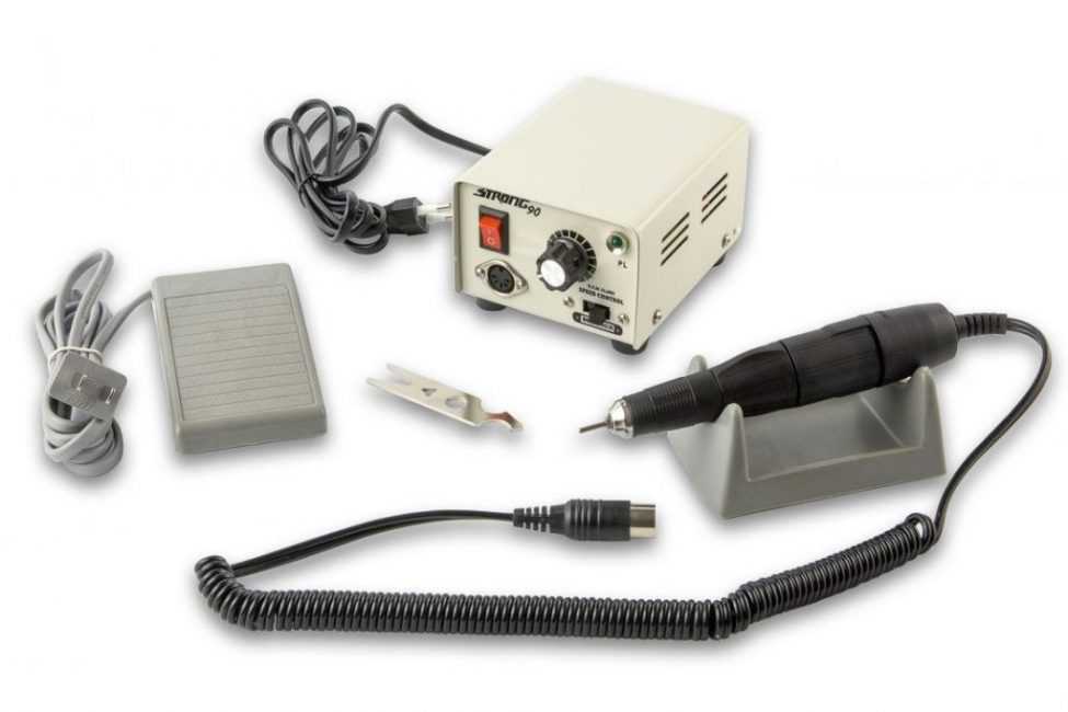 Аппарат для маникюра и педикюра Strong 90/102L. В компактном корпусе помещен двигатель мощностью 64 Вт. Он обеспечивает скорость вращения насадок до 35000 оборотов в минуту. На панели расположен регулятор числа оборотов, тумблер включения и кнопка реверса. Металлический корпус надежно защищен от ударов. В магазинах можно найти модификации модели с педалью в комплекте или без нее.