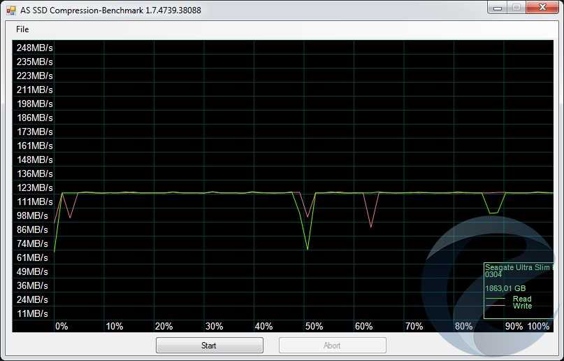 Как вытекает из результатов, полученных во время тестирования, на лицо стабильная работа на чтение и запись. Серьезных сбоев или перекосов в работе диска не наблюдается. Средняя скорость чтения составляет примерно 120-130 Мб/с, как впрочем и скорость записи 120-130Мб/с. Результаты схожи с показателями конкурентов, что весьма ожидаемо.