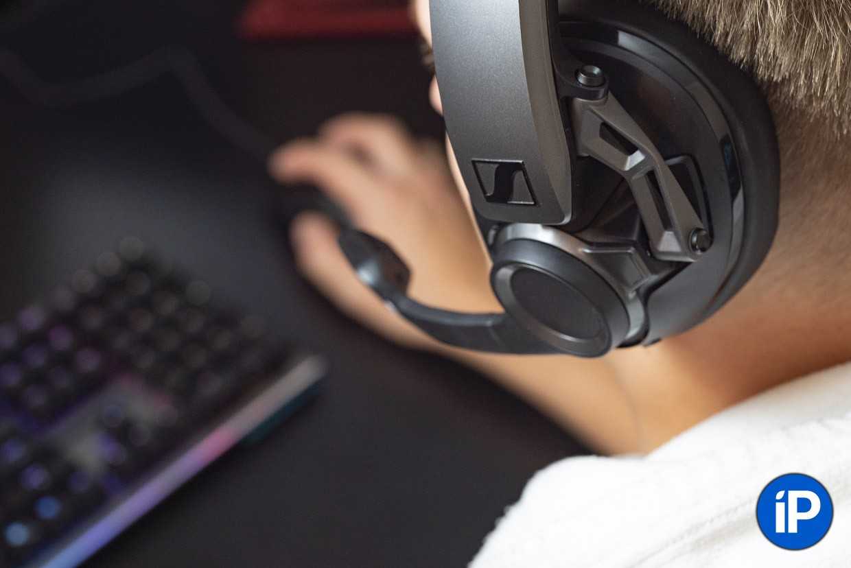 Даже на мою большую голову (кепки Gucci приходится искать XL, а это редкость) гарнитура села как надо, мегакомфортно, просто топ. Штанга микрофона, как и во многих других игровых гарнитурах, подвижна: когда вы её отклоняете вверх, раздается щелчок, звук отключается. Это удобно, можно поговорить с женой, по телефону и потом вернуться в игровой чатик.