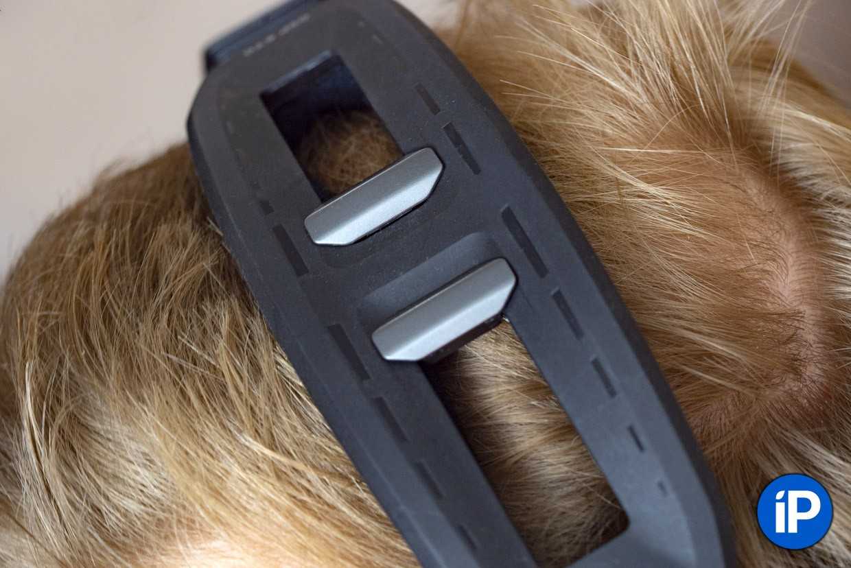 Регулировка оголовья происходит в два приёма. Первый — стандартный, двигаем чашки по пластиковым направляющим. Второй приём — двигаем ползунки на верхней части оголовья, они отвечают за плотность прилегания чашек, как бы сдавливают их.