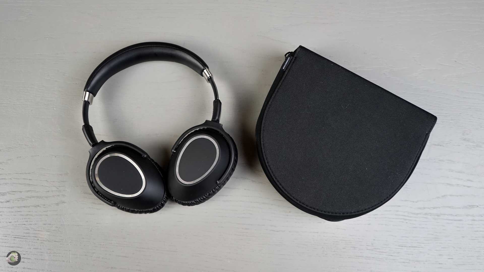 Качество сборки тоже впечатляет. Алюминиевых элементов на внешней части здесь нет, но пластик кажется надёжным и приятным на ощупь, никакого скрипа при регулировании длины или просто во время использования не возникает. Наушники складываются, благодаря чему их удобно класть в небольшой комплектный чехол. Помимо него, у нас есть переходник для подключения при перелётах и кабель зарядки.