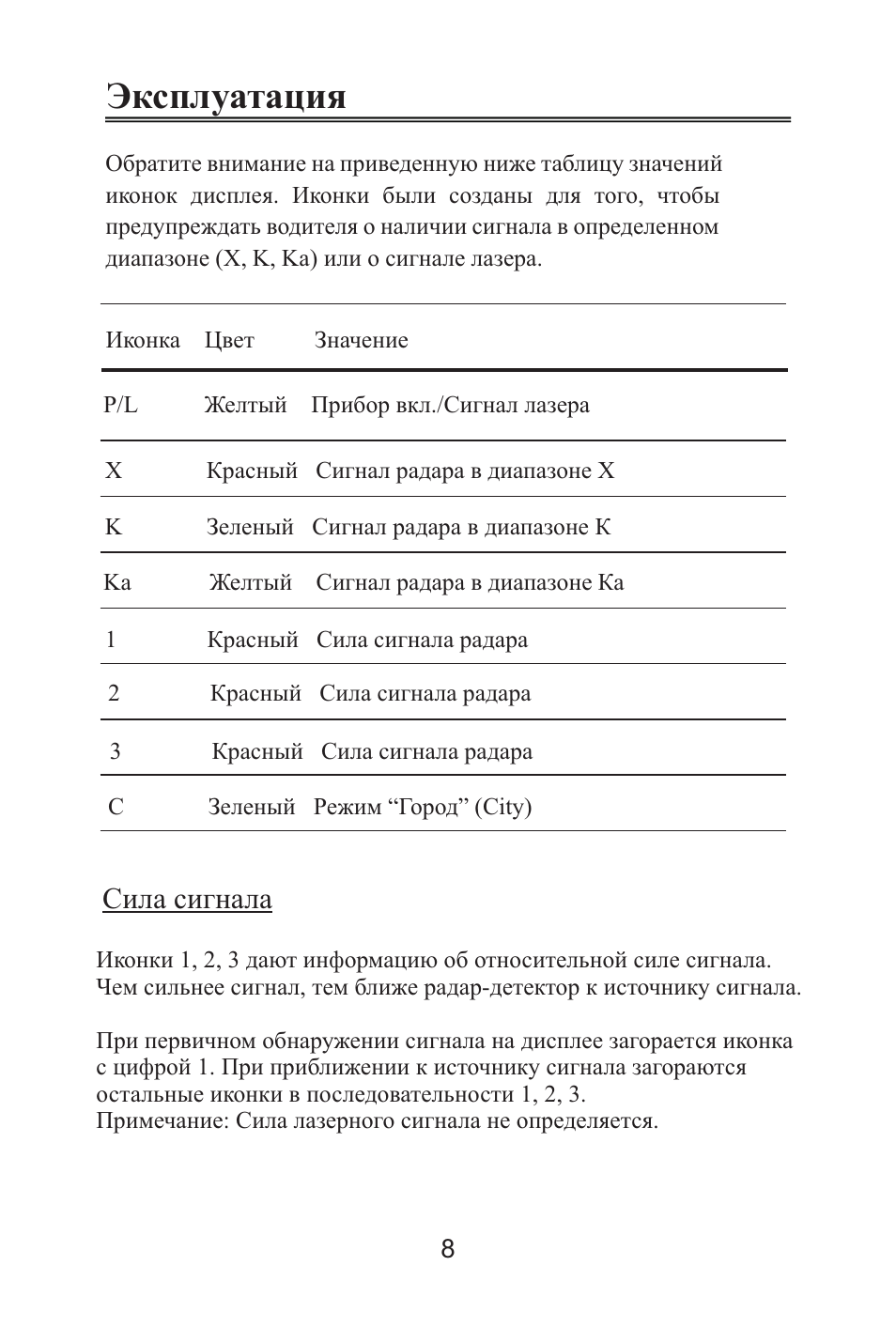Обратите внимание на приведенную ниже таблицу значенийиконок дисплея. Иконки были созданы для того, чтобыпредупреждать водителя о наличии сигнала в определенном диапазоне (Х, K, Ka) или о сигнале лазера