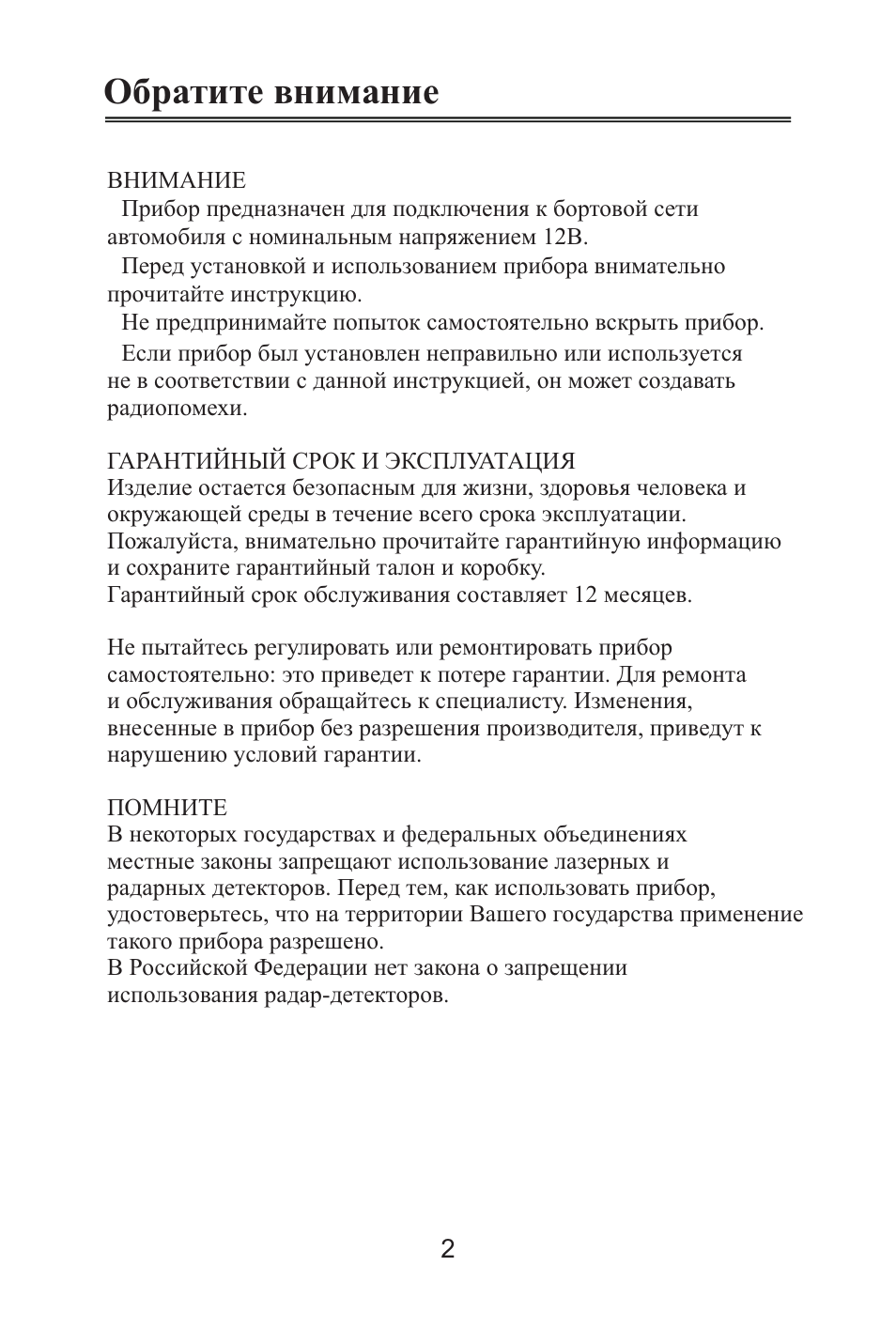 ПОМНИТЕВ некоторых государствах и федеральных объединенияхместные законы запрещают использование лазерных ирадарных детекторов. Перед тем, как использовать прибор,удостоверьтесь, что на территории Вашего государства применениетакого прибора разрешено.В Российской Федерации нет закона о запрещениииспользования радар-детекторов.