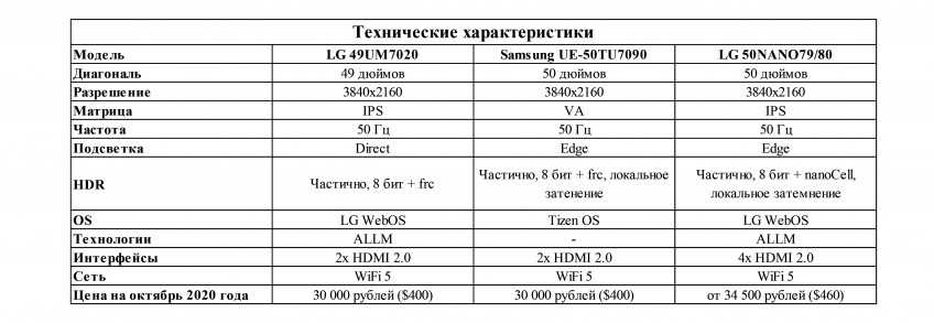 LG 50NANO79 — По характеристикам близок к прошлым моделям, но матрица чуть более продвинутая благодаря использованию подсветки Nano Cell, плюс есть четыре HDMI. К сожалению, не заявлен VRR и не известно время инпут лага. Зато появилась Edge-подсветка.