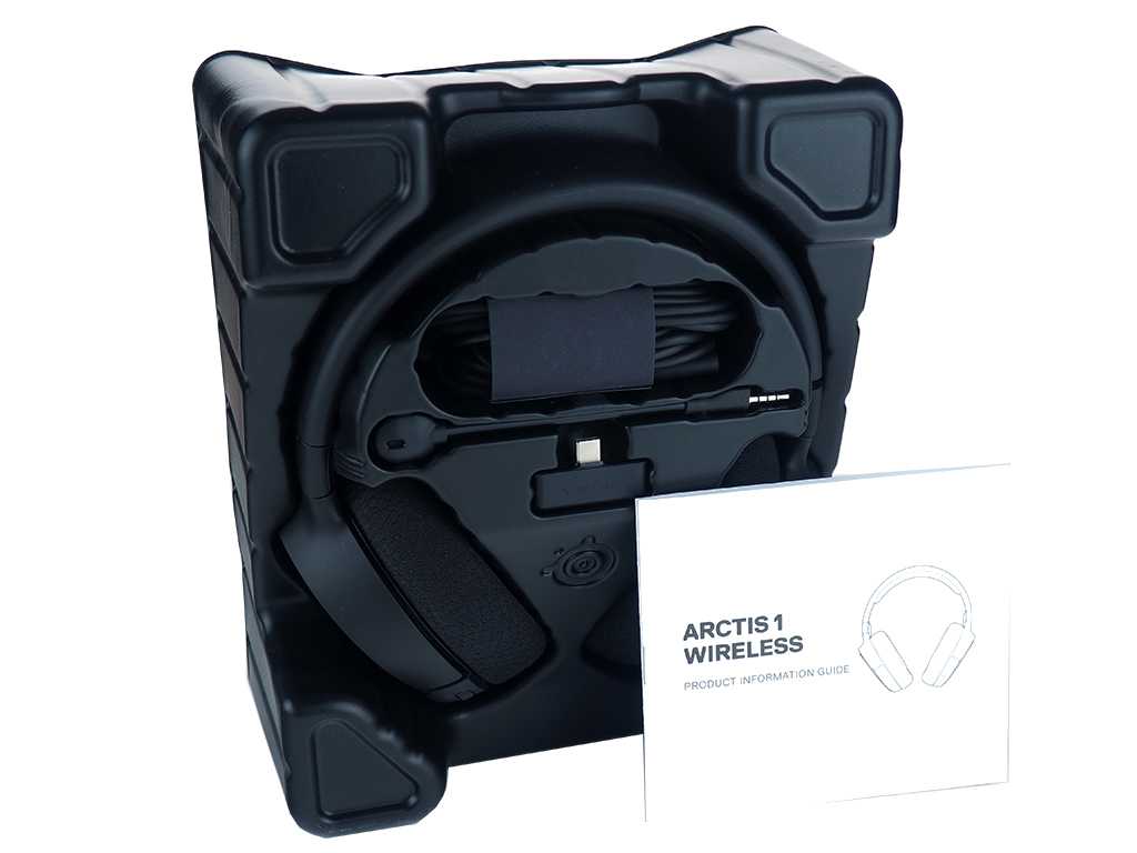 Наушники поставляются в достаточно крупной коробке, размеры которой связаны не только с габаритами самих наушников, но и весьма обширным комплектом поставки. В который, помимо наушников и документации входят: док-станция, которая также является передатчиком, второй аккумулятор, кабель для подключения дока к ПК или консоли, кабель дополнительного питания, оптический кабель, кабель для подключения наушников к USB-порту для зарядки, кабель для проводного подключения к USB-порту. Также комплект включает поролоновую насадку на микрофон.