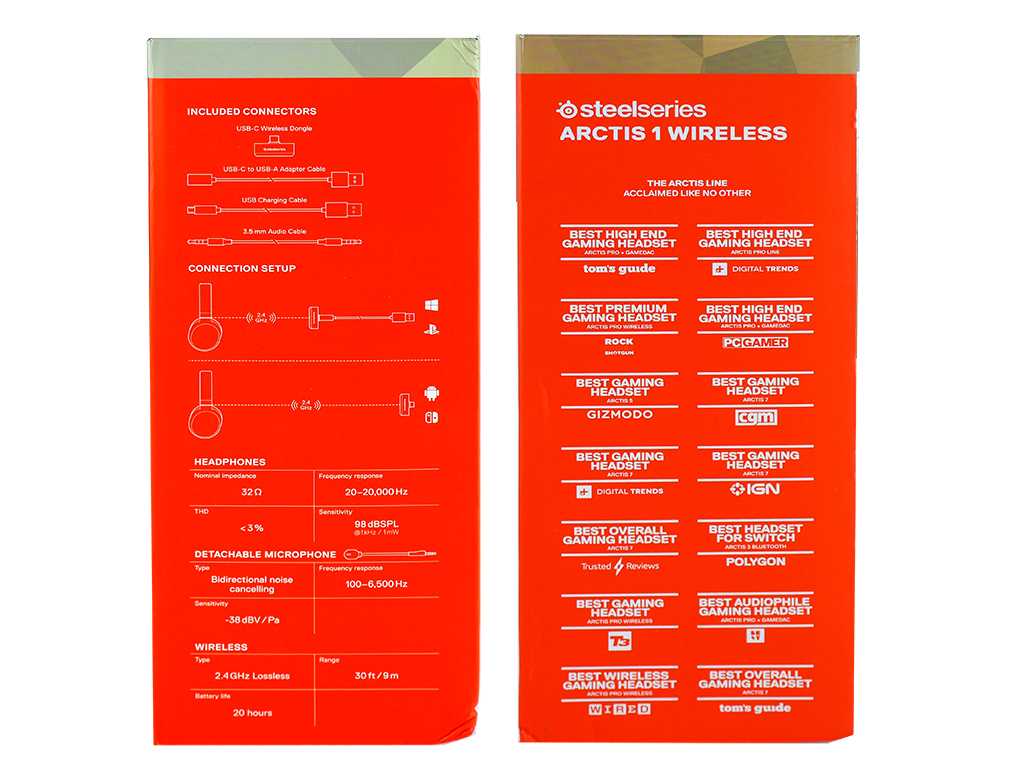 На лицевой стороне – изображение наушников, список ее особенностей (в числе которых беспроводное подключение, большой срок работы от батареи и стальная конструкция оголовья), а также привлекающий внимание значок от PC Gamer с наградой «Лучшая беспроводная игровая гарнитура»