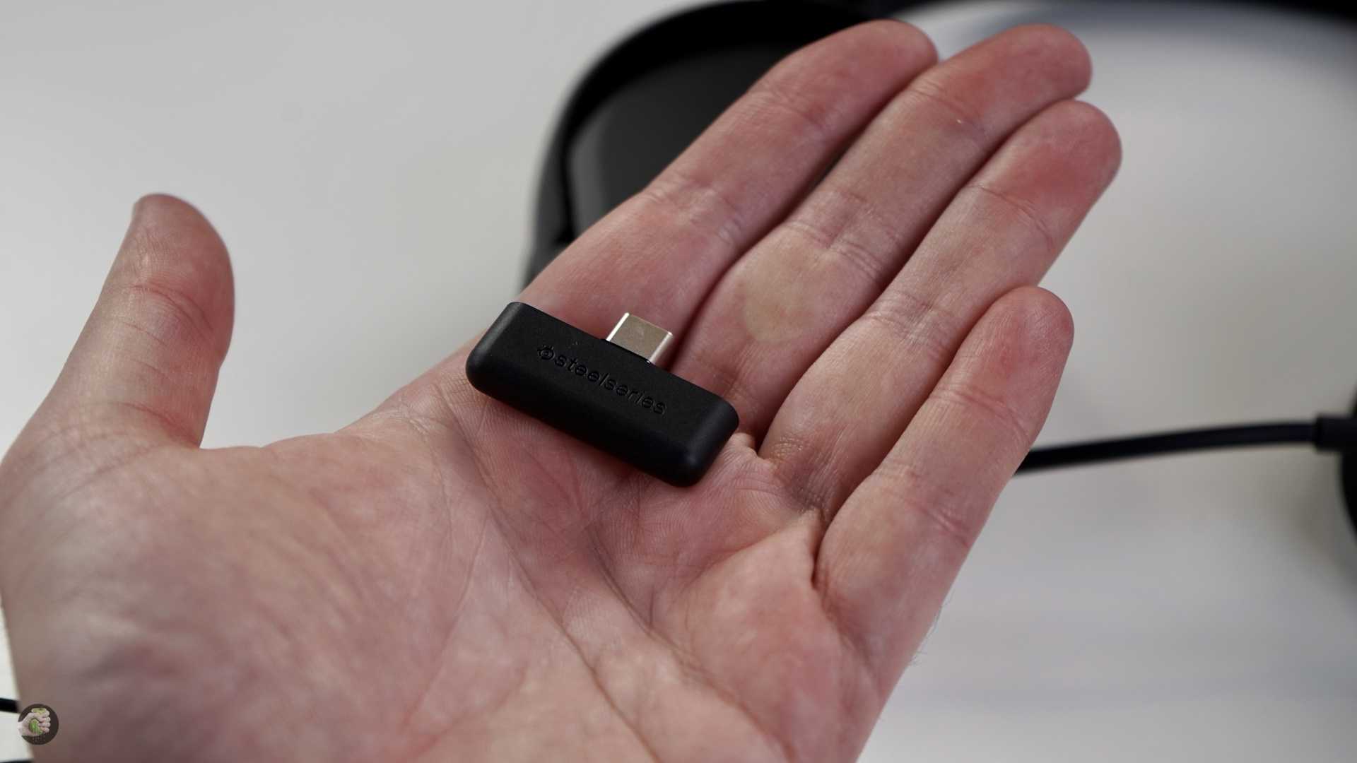 Считаю, в Steelseries придумали оптимальную систему подключения гарнитуры к чему угодно. В комплекте есть адаптер со штекером USB Type-C, нигде толком не говорится, что за тип связи используется — в официальных документах просто беспроводное подключение, частота 2,4 ГГц, дальность 9 метров. Вероятно, мы имеем дело с Bluetooth, но и тут есть нюанс: подключение крайне надёжно, я ни разу не почувствовал помех, даже если ходишь по комнате. Стальное удержание!