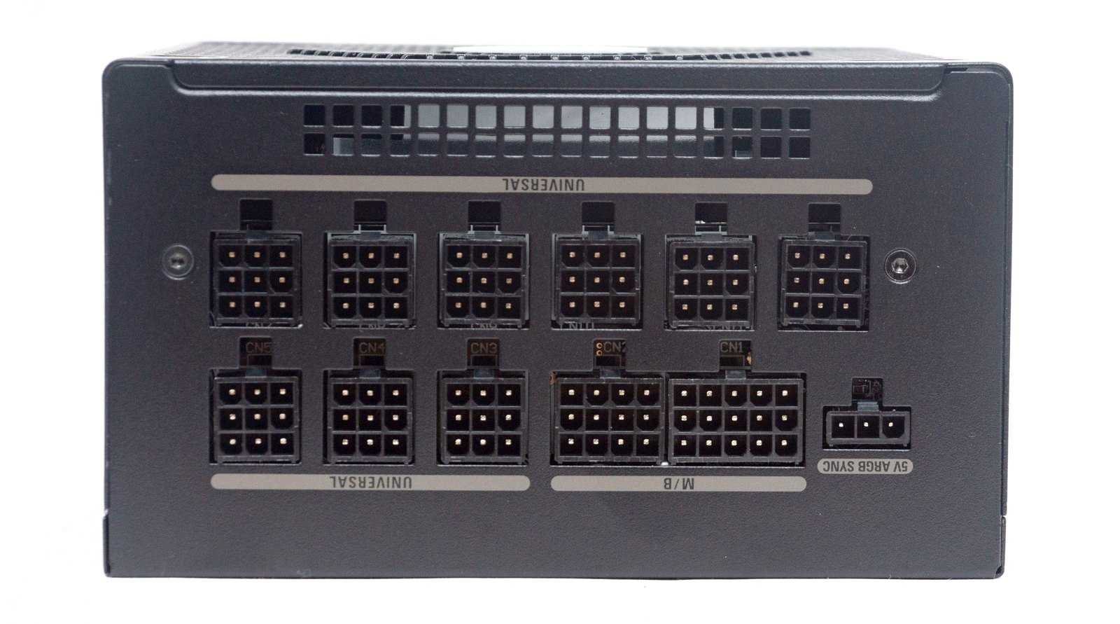 На тыльной панели в два ряда разместились разъемы для подключения модульных кабелей. Сверху два разъема на 12 и 15 контактов для основного кабеля. Все остальные разъемы по 9 контактов: три по три. Они подписаны как универсальные, в любой можно подключать хоть CPU, хоть VGA или SATA кабели. Такая универсальность без конкретной привязки удобна для наиболее выгодного размещения кабелей. Отдельно в углу находится 3-пин разъем для кабеля синхронизации подсветки.